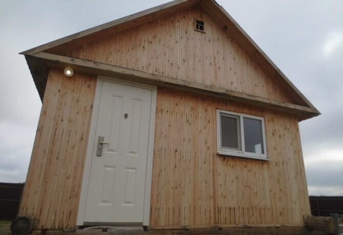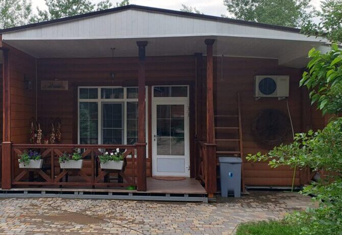 - Одноэтажный дом на 8 мест: терраса, гостиная-кухня, две спальни, санузел с душевой кабиной.