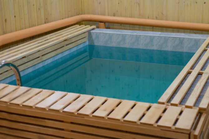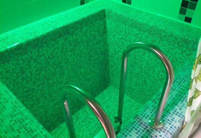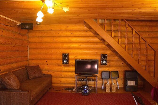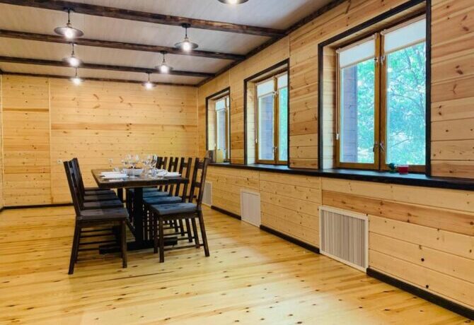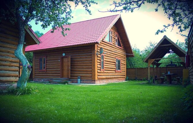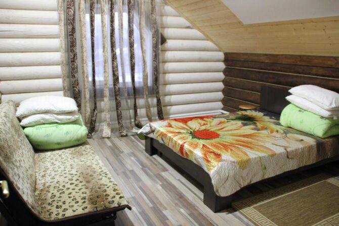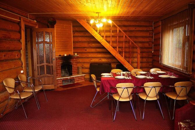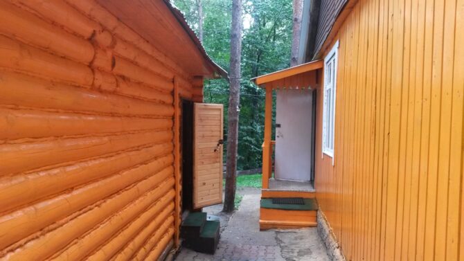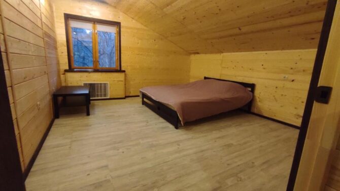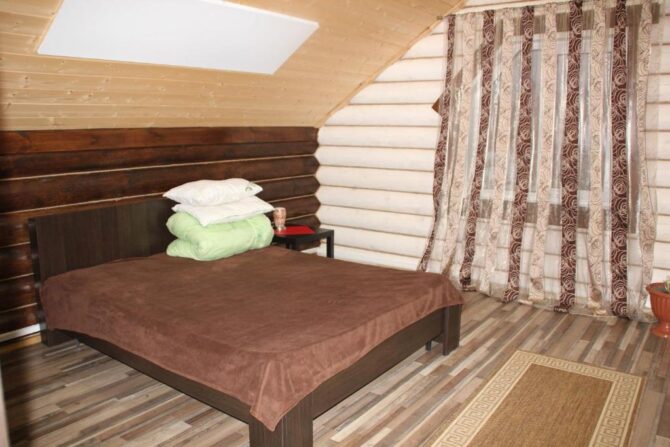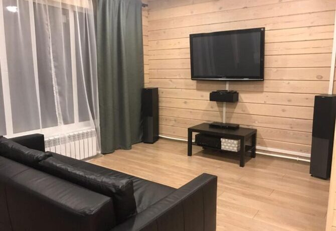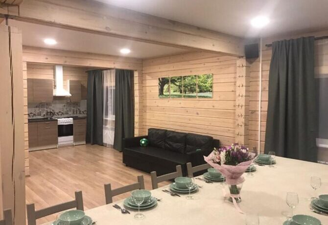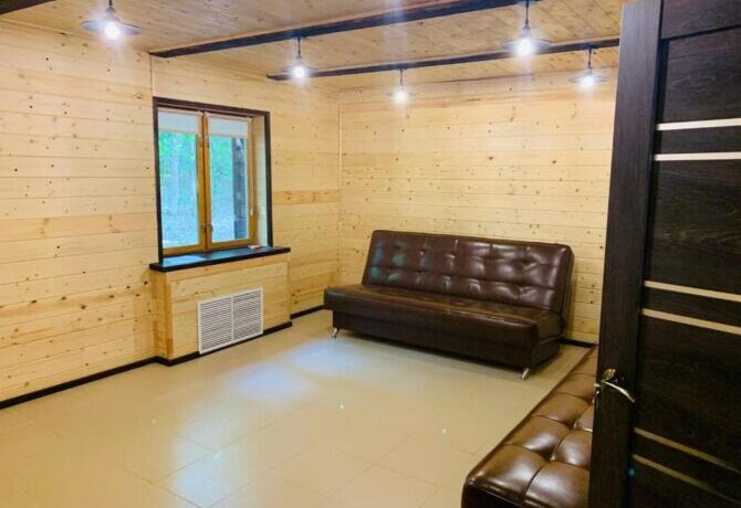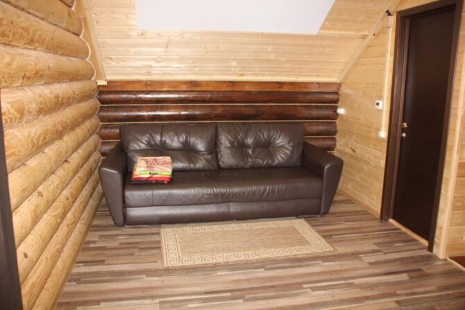 - Бревенчатый дом-баня на 12 гостей, с бассейном, удобствами и комнатой отдыха. Есть музыкальный центр с караоке, две маленькие спальни.