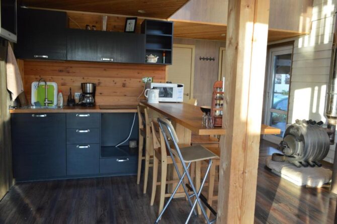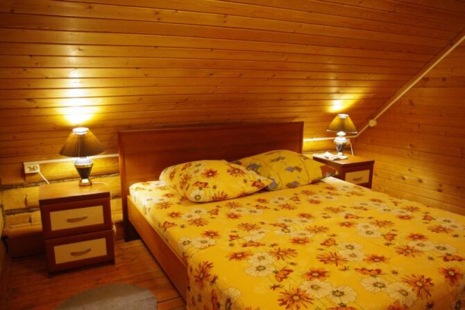 Деревянный домик порадует чистым постельным бельем, выскобленными полами и достойными двуспальными кроватями. Не порадует плохонькой кухонной плиткой, шумными батареями и перебоями с работой водонагревателя. У этих же владельцев есть несколько других вариантов размещения. Предложения аналогичны, варьирует лишь размер домиков.