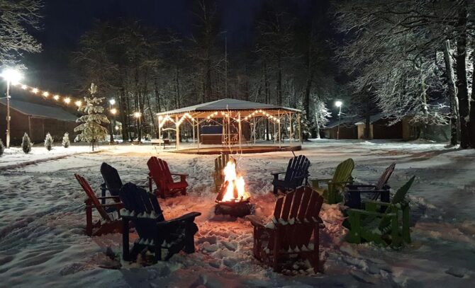 Встреча Нового года на базе отдыха «Просто лес» включает в себя праздничный ужин в ресторане. Живая музыка, конкурсы, танцы – все это ждет гостей загородного отеля. Кульминация новогоднего праздника – песни у костра и яркий фейерверк на территории Just Wood.