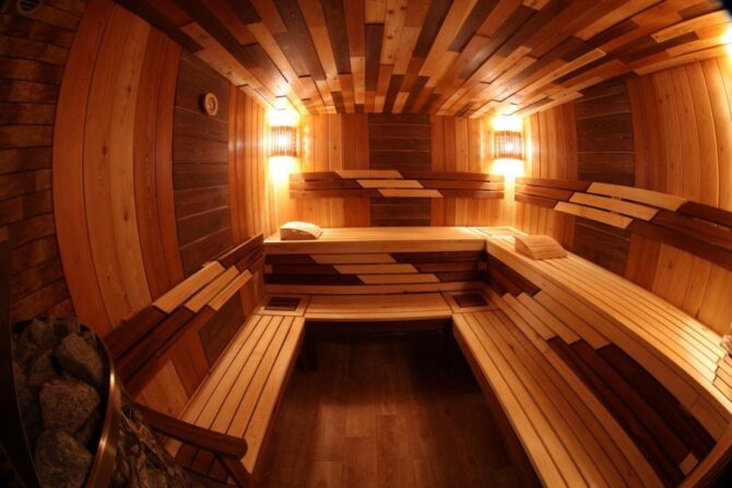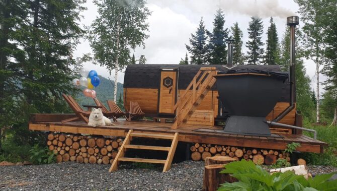 - На территории есть зона сауны, где установлена большая купель (предоставляются веники), чан, где можно посидеть в теплой воде с различными травами в морозный день с видом на горы. Также есть мангал со всеми атрибутами.