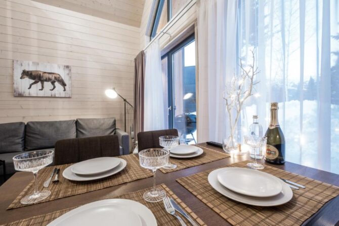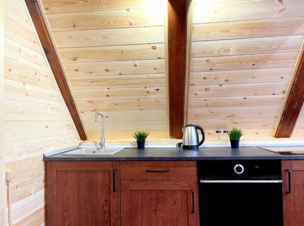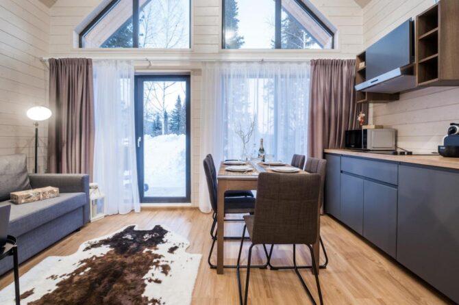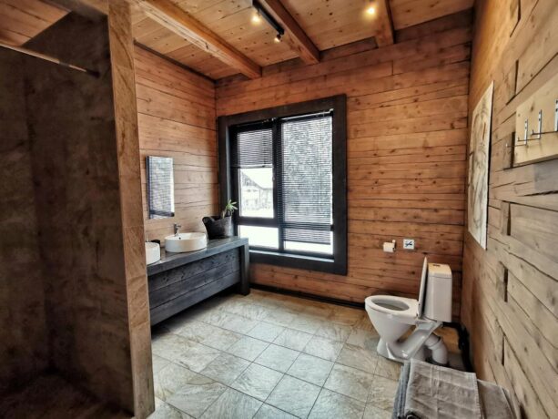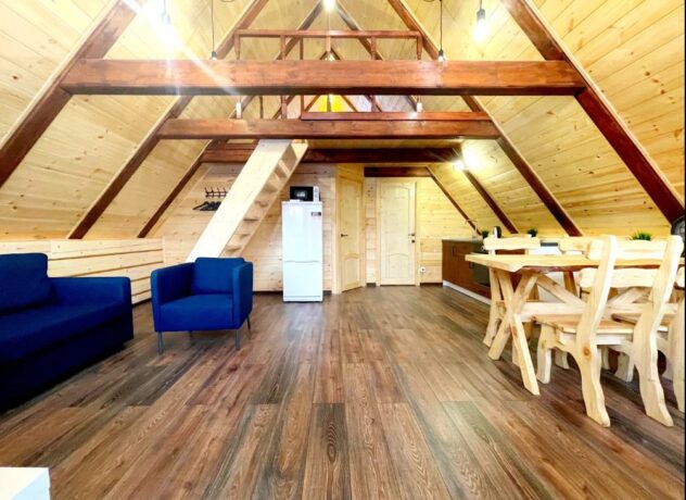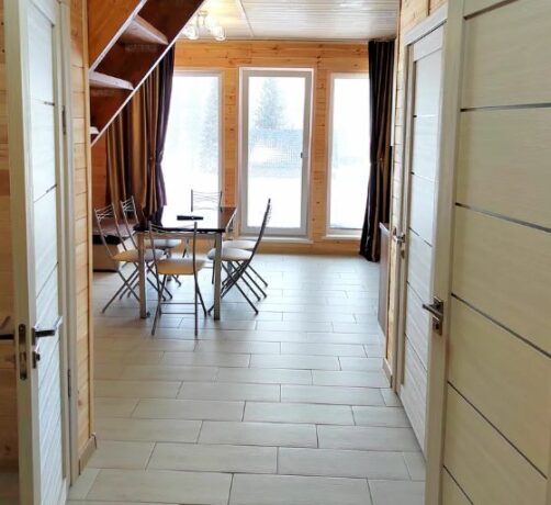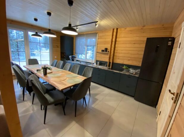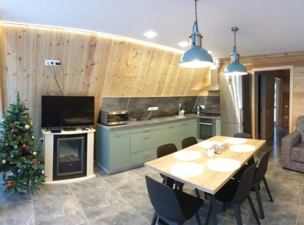 Шале сохраняет некоторые признаки идентичности старорусского традиционного стиля. Это просматривается, например, в том, что снаружи и внутри шале отделано деревом. Планировка пространства гармонизирует между комнатами. Столовая и гостиная представляют собой стильные комнаты с большим количеством света. В гостиной есть телевизор со спутниковым ТВ, диван и стол. Кухня включает в себя все необходимое оборудование, чтобы гарантировать комфорт проживания: