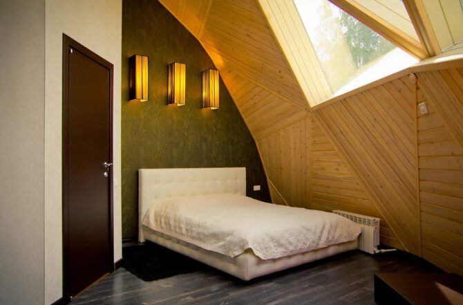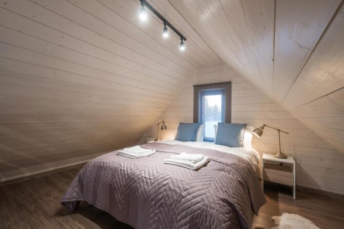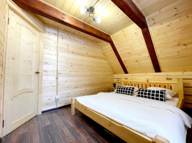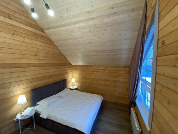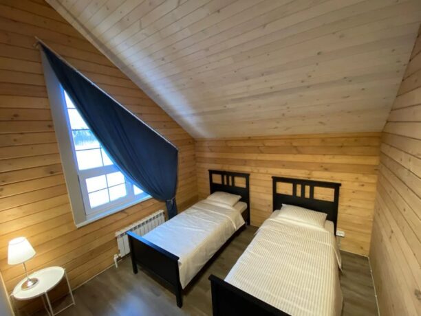 - Спальня 2 (второй этаж): двуспальная кровать, прикроватный столик.