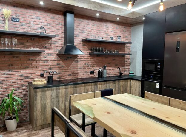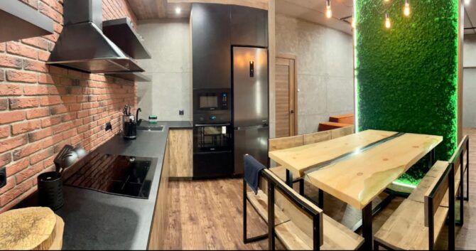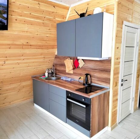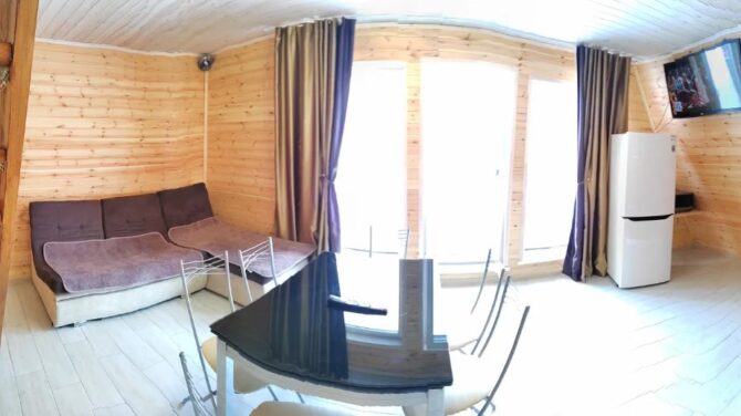 - Кухня-гостиная: зона для готовки со всей необходимой техникой и посудой, деревянный стол со стульями, диван, кресла, телевизор, вешалки для одежды.
