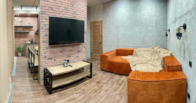 - гостиная с трехместным диваном и большим телевизором Smart TV;