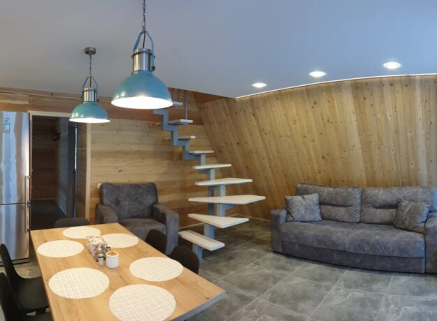 Этот дом идеально подойдет тем, кто предпочитает уединение. Расположенный в нескольких минутах езды от трас, он предлагает невероятный панорамный вид и спокойную атмосферу, позволяющую отдохнуть от города.