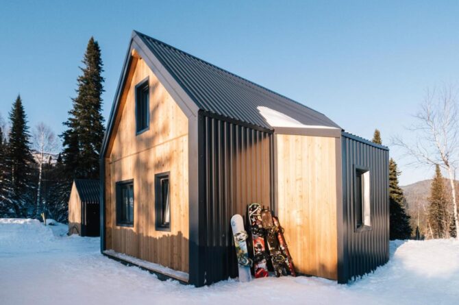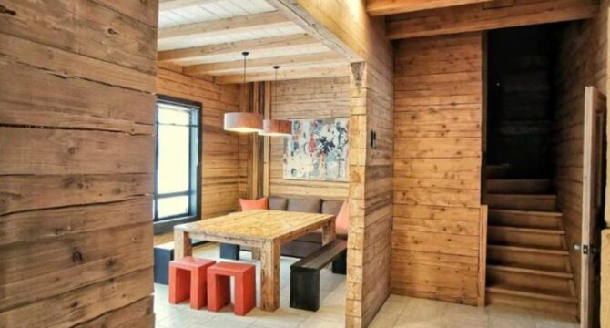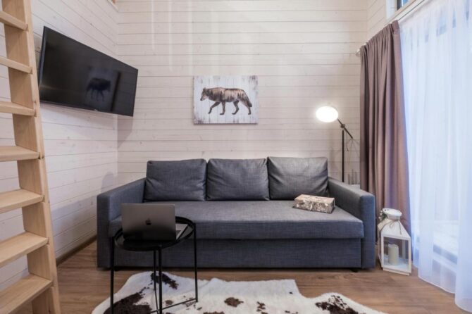 Дома небольшие (всего 60 квадратных метров), двухэтажные и выполнены в амбарном стиле. При этом внутри домов много места, нет лишних перегородок, а большие окна от пола до потолка создают ощущение единения с природой. Вся гамма красок и натуральные материалы также переплетаются с природой за окном.