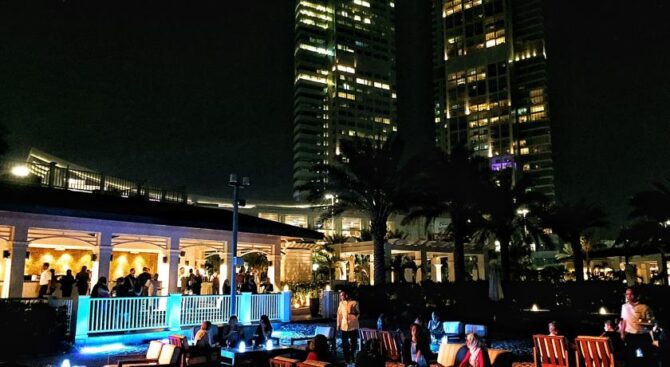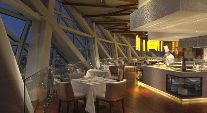 В отеле работает 7 ресторанов, 2 бара и несколько лаундж-зон, где также можно пообедать или поужинать. Завтраки для гостей предоставляются в формате «шведский стол», а также их можно заказать в номер. Рядом с отелем находится оживленный квартал с развлечениями, барами, дискотеками и ресторанами.