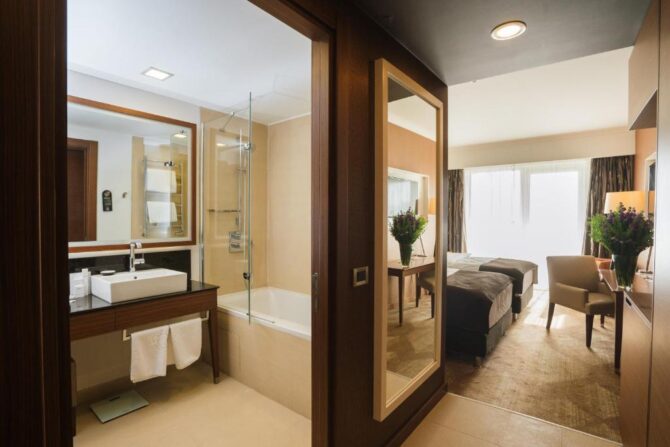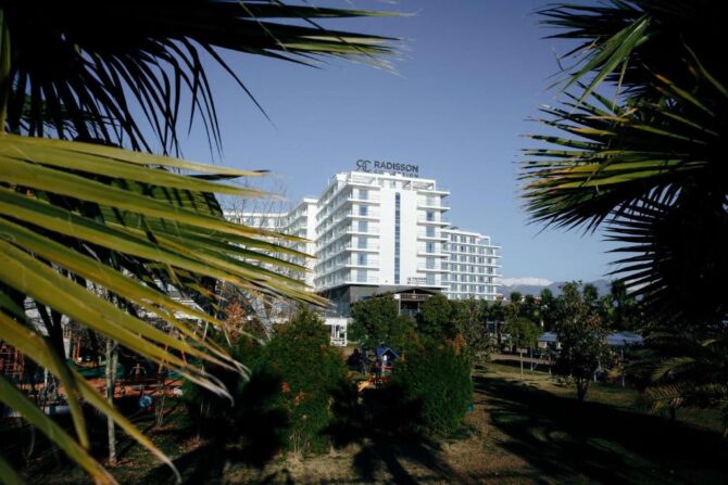 Огромный сетевой отель Radisson Collection Paradise Resort and Spa Sochi предлагает для размещения 508 комфортабельных номеров и 6 отдельно стоящих вилл. Вся территория закрыта от посторонних и находится под круглосуточной охраной. Пакетные предложения включают широкий спектр услуг от организации семейного отдыха с детьми до проведения разнообразных мероприятий для всех возрастов. В стоимость проживания включены завтраки по системе шведского стола, тренажерный зал, бассейн, СПА и термальная зона. В новогоднюю ночь готовится сразу несколько тематических вечеринок. Взрослых будут ждать накрытые столы в ресторанах, уникальные шоу-программы и дискотека до утра. Детей будет развлекать профессиональная команда аниматоров. Развлечения продлятся все зимние каникулы. Отель бесплатно организует трансфер на Красную Поляну. Для любителей спорта обустроены открытые площадки для тенниса, футбола, волейбола и других командных игр. В одном из залов корпуса оборудована комната для релаксации, для детей имеется игровая комната с воспитателем. Услуги няни предоставляются за отдельную оплату.