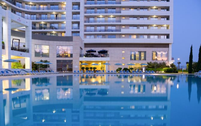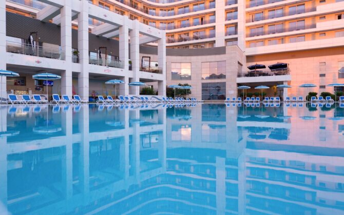 И это не просто отель для пляжного отдыха — здесь гости могут получить широкий спектр услуг по оздоровлению и лечению, заниматься спортом на огромной территории, принимать солнечные ванны на комфортном пляже. Комплекс состоит из нескольких корпусов различного класса и также имеет залы для проведения конференций.
