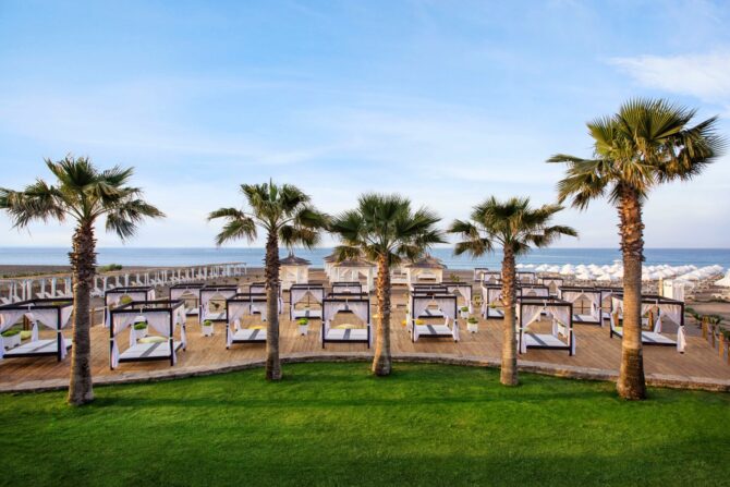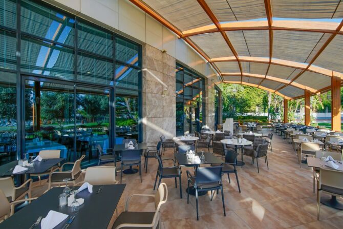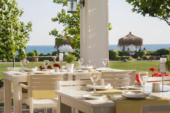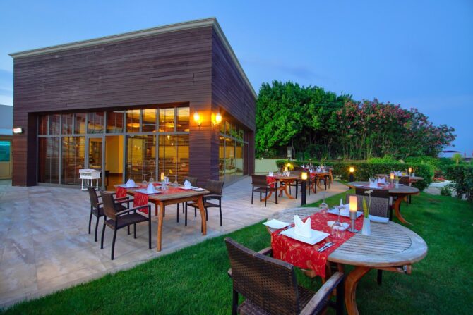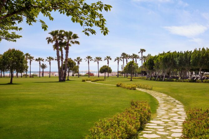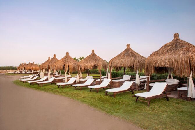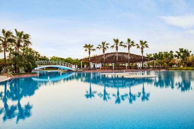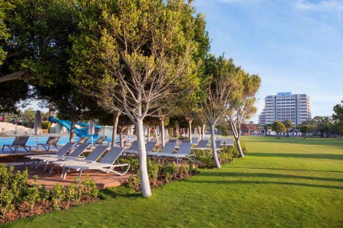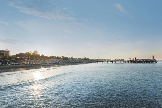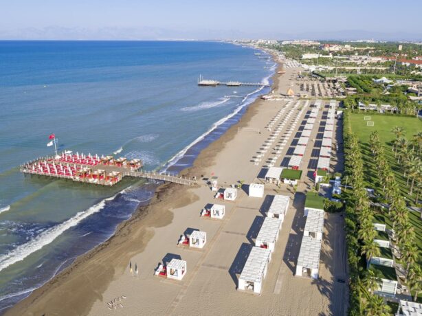 Огромная зеленая территория — прекрасный променад до песчаного пляжа, качество которого высоко оценено наградой Голубой флаг. Несколько бассейнов для взрослых и детей, аквапарк, центр водных видов спорта и множество спортивных площадок удовлетворят желания всех гостей, профессиональная команда аниматоров развлекает детей днем и порадует ярким национальным шоу вечером.