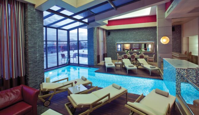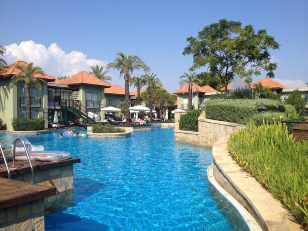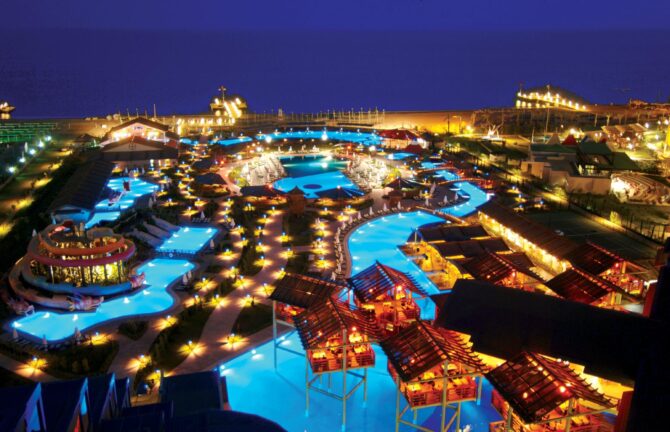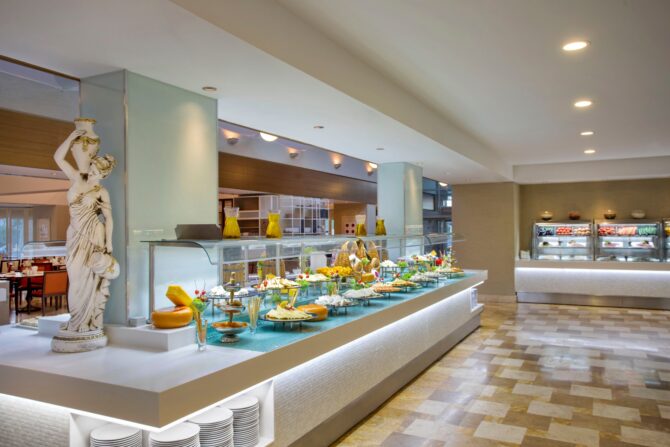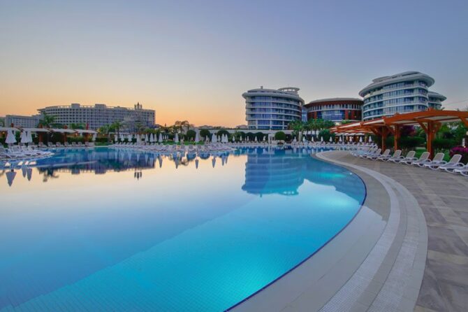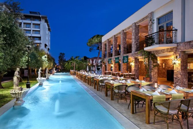 Питание гостей проходит по системе ультра все включено, в ресторанах и барах отеля, и повара нескольких ресторанов а — ля карт предложат вам отведать блюда турецкой, итальянской, средиземноморской кухонь. “Изюминкой“ комплекса является огромный бассейн, занимающий значительную часть территории.