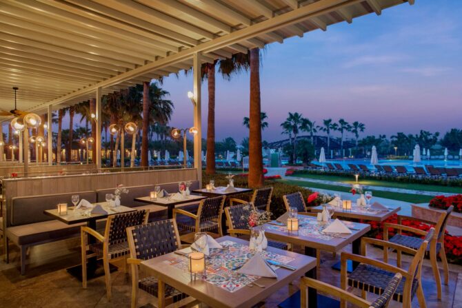 Несколько ресторанов, оформленных в разных стилях, предлагают гостям кухни всего мира, бары на территории и у бассейнов открыты для посетителей до позднего вечера. Ваш вечер украсит живая музыка и изысканная подача блюд.