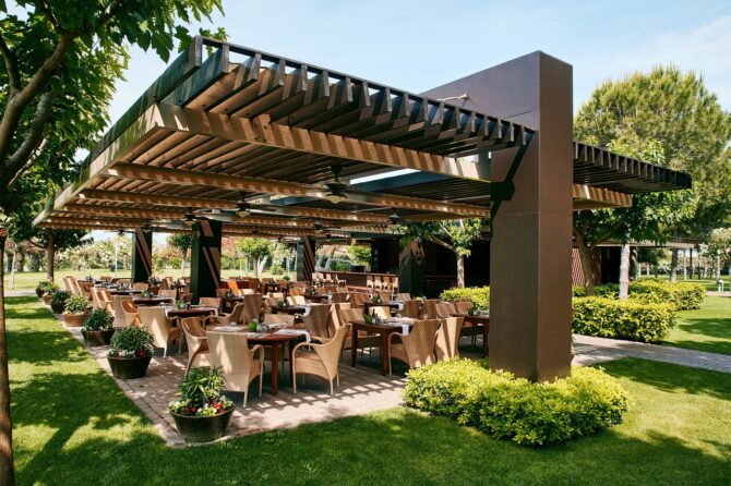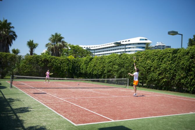 Преимуществом данного отеля является необъятная территория с расположенными на ней полем для гольфа, теннисными кортами, бассейнами и аквапарком, боулингом и множеством других спортивных площадок. Такого выбора досуга вы не найдете ни в одном отеле на побережье!