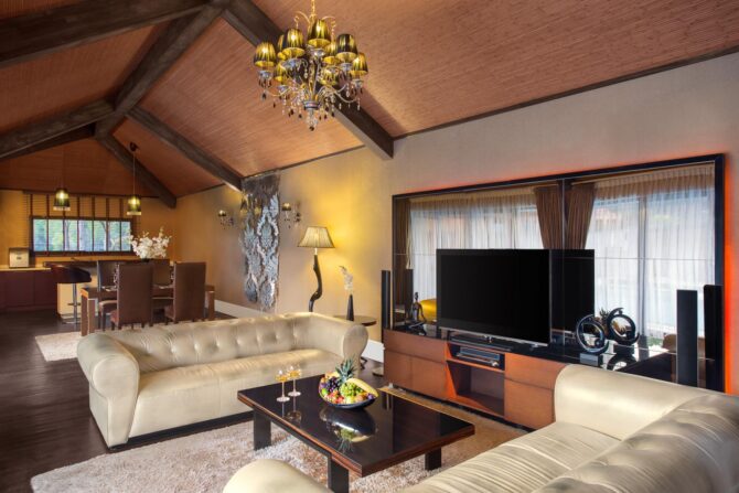 Размещение гостей возможно как в главном здании, так и в отдельных виллах, домиках у озера, окруженных великолепным садом с бассейном. Все комнаты дизайнерски оформлены в национальном стиле, изысканная мебель и оснащение придают гармоничность и уют. Курорт предлагает вип — сервис для самых взыскательных гостей.