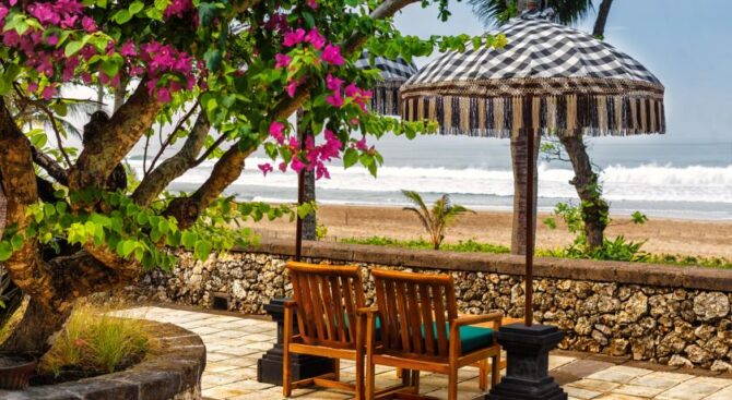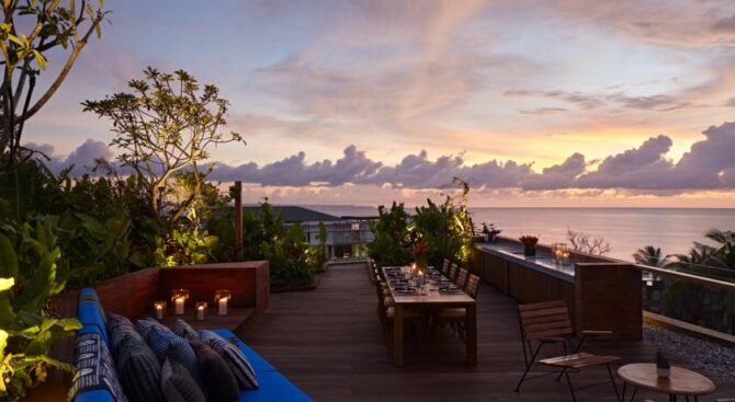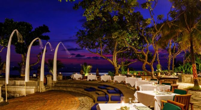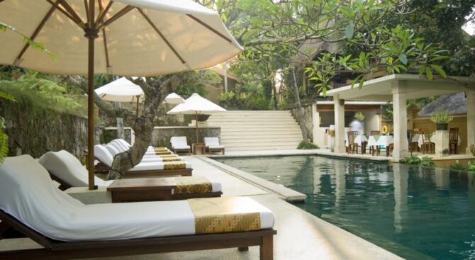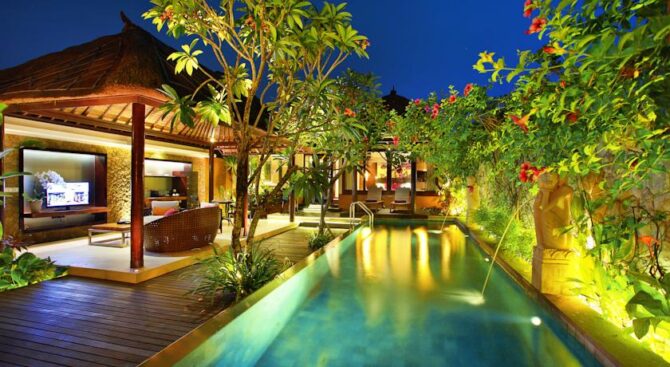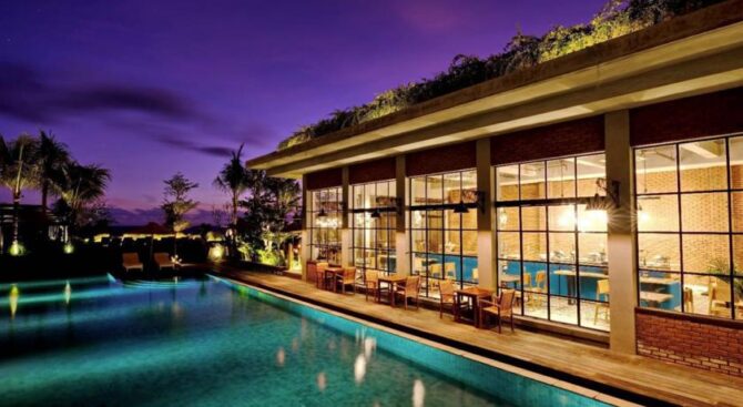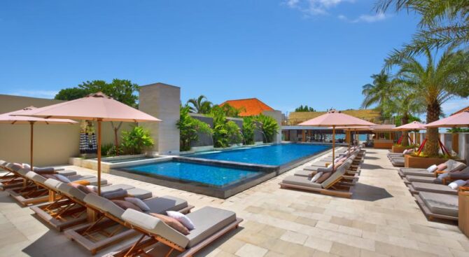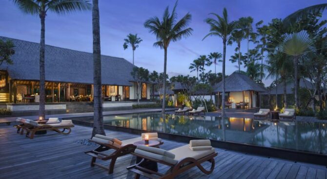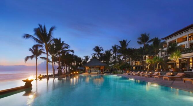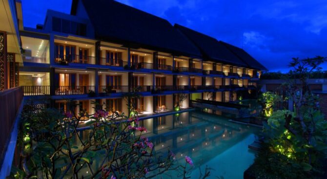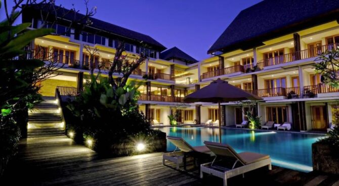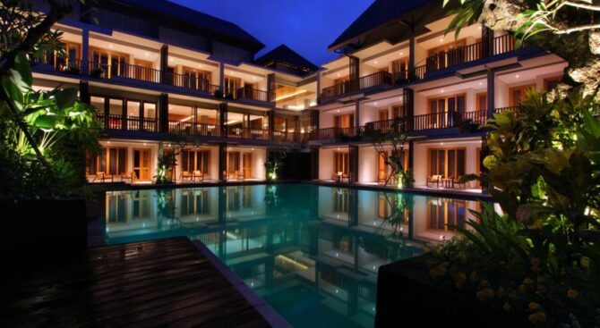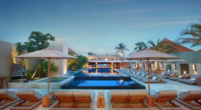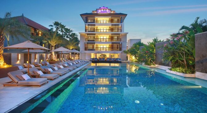 Интересуют лучшие отели Бали 5 звезд? К вашему вниманию The Legian Bali — отель, каждый из 49 номеров которого выполнены в современном стиле. Будьте готовы к тому, что номер настолько впечатлит и выходить из него не будет желания, даже несмотря на то, рядом Индийский океан. На территории отеля есть бассейн. Отобедать вкусными блюдами или наслаждаться различными напитками вы можете на крыше здания, откуда открыт прекрасный вид на океан.