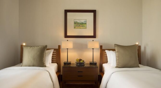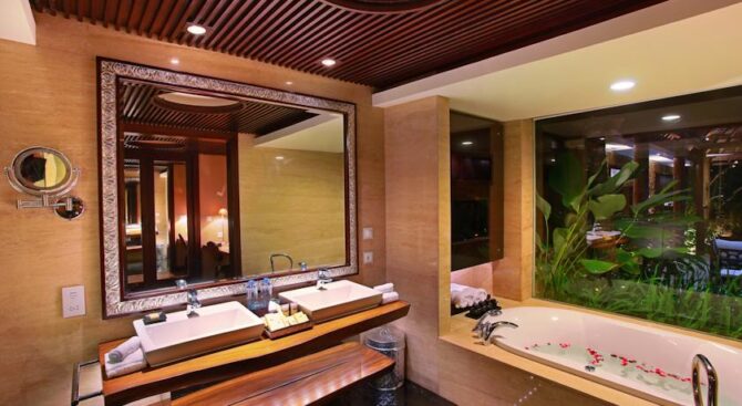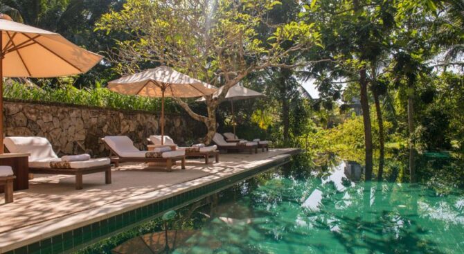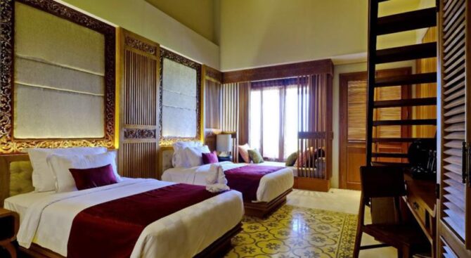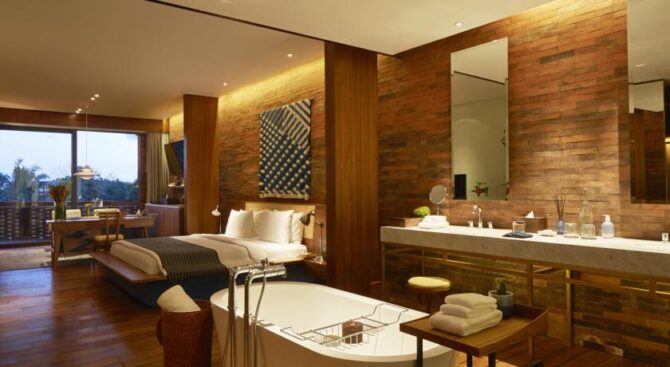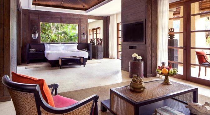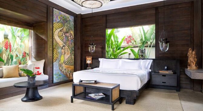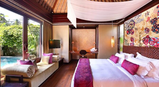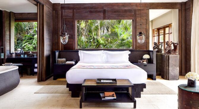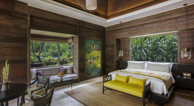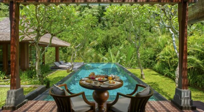 Отель Mandapa, A Ritz-Carlton Reserve радо открывает перед вами cвои двери. Он обладает 60 номерами. Да, это действительно рай на земле, где каждый отдыхающий — это король. Остановиться вы можете на вилле или в люксе, где имеется сейф, мини-бар. Для вас на выбор имеется и ванна, и душ — все это в вашем номере. Также здесь есть полотенца из натуральной ткани, халаты и так далее. Отметим, что из многих номеров открывается прекрасный вид на реку и тропический лес. Да, это действительно один из лучших отелей Бали 5 звезд.
