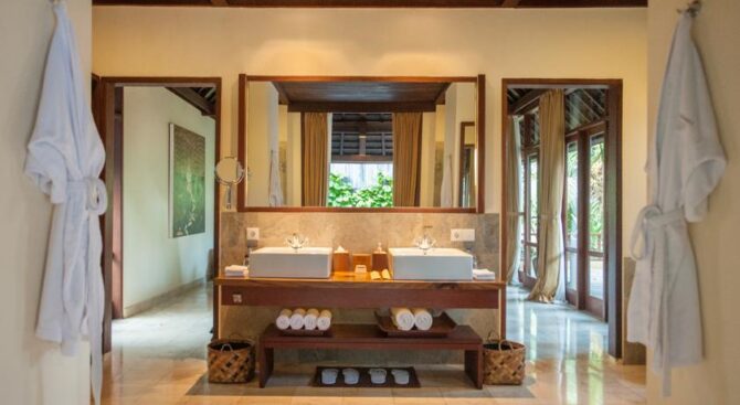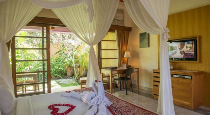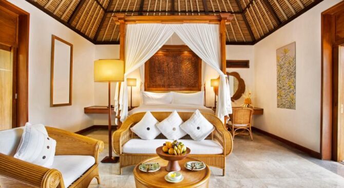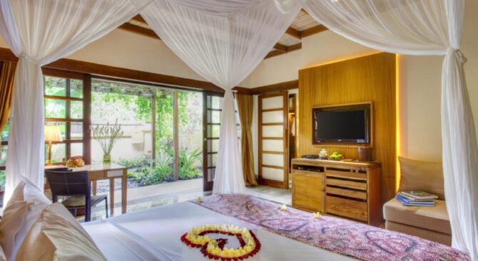 Komaneka at Tanggayuda Ubud — один из лучших отелей Бали 5 звезд. Здесь с больших окон вашего номера будет открыт прекрасный вид на индийский океан. Если вам будет жарко — воспользуйтесь кондиционером, скучно — посмотрите телевизор. В ванной комнате имеется и ванна, и душ. А также здесь представлены лучшие косметические средства. Кроме всего прочего, найдете в своем номере кофеварку, кофе и чай.