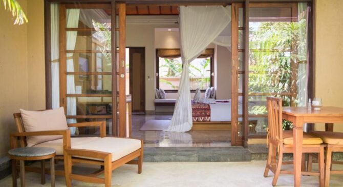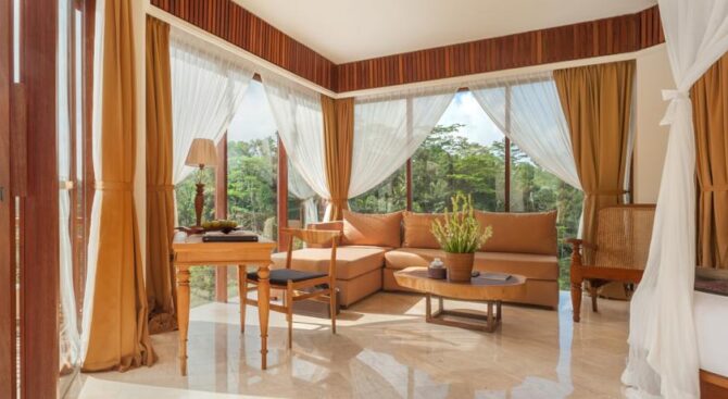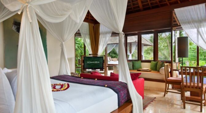 14 номеров одного из лучших отелей Бали 5 звезд Komaneka at Monkey Forest Ubud оформлены в интересном балийском стиле, который успокаивает и заставляет всецело отдаться отдыху, а также погрузиться в неистовое веселье. В номерах имеются балконы, где вы можете утром с чашкой кофе или чая наслаждаться пейзажами Бали.