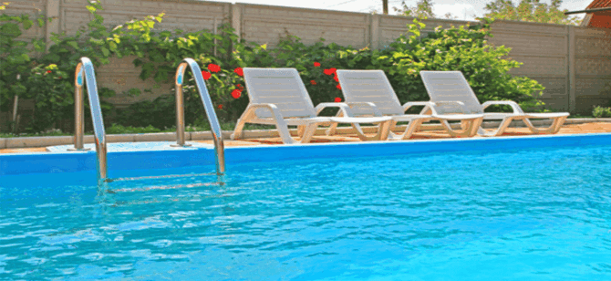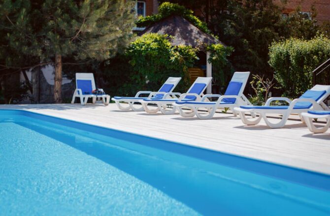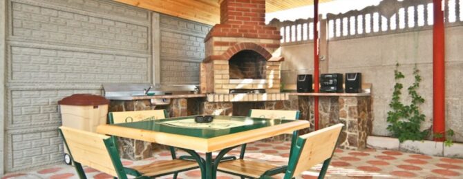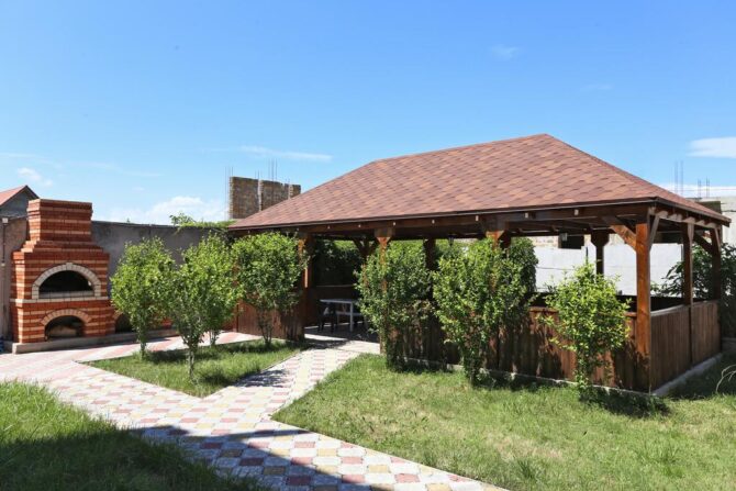 - уютный двор с мангалом, беседкой, бассейном и зоной отдыха с шезлонгами;