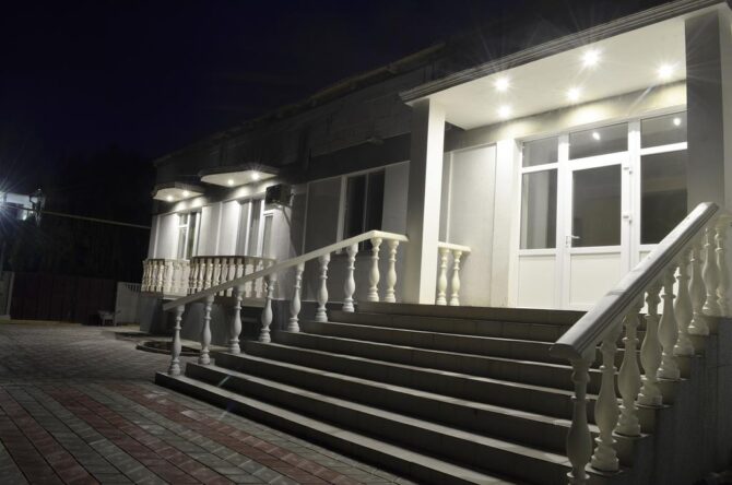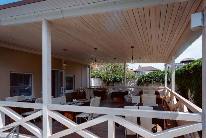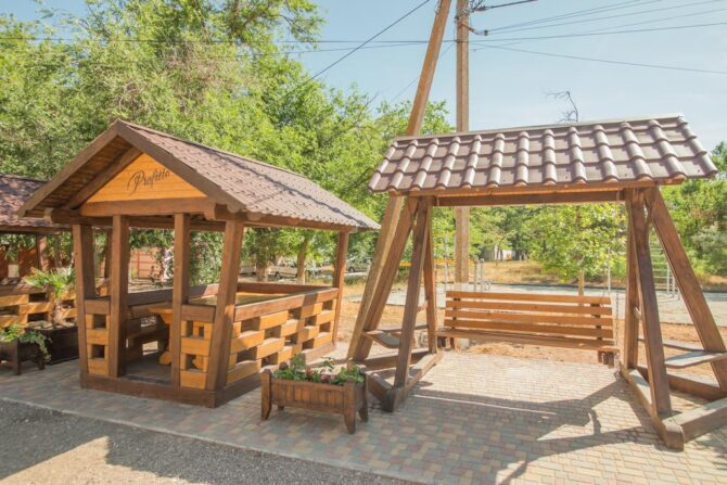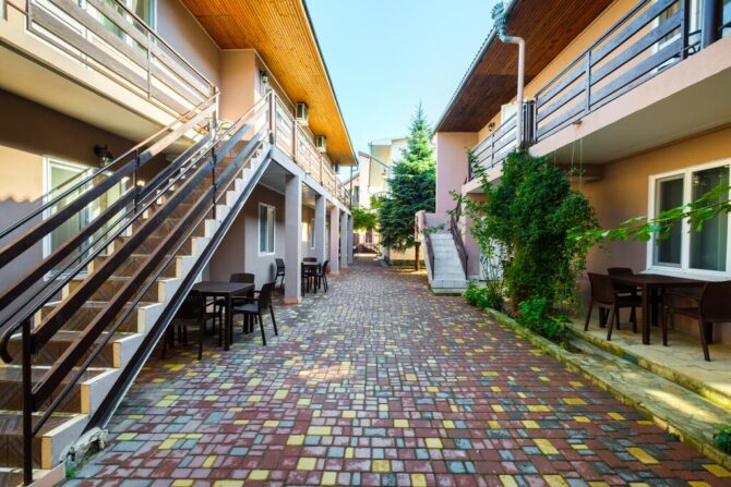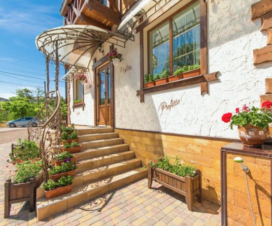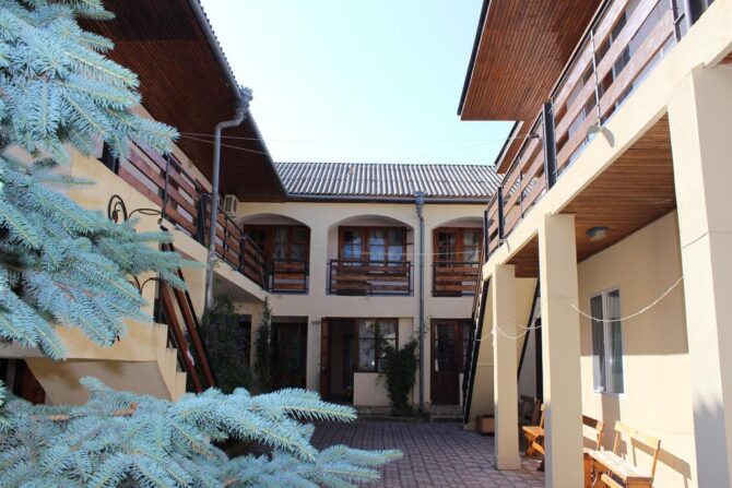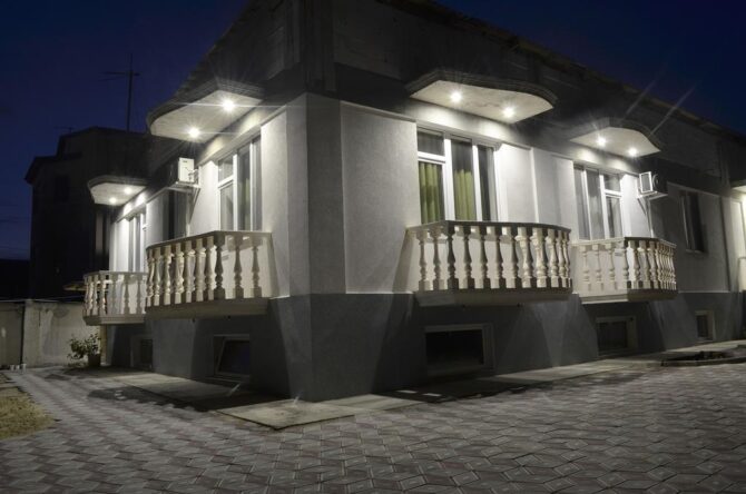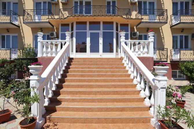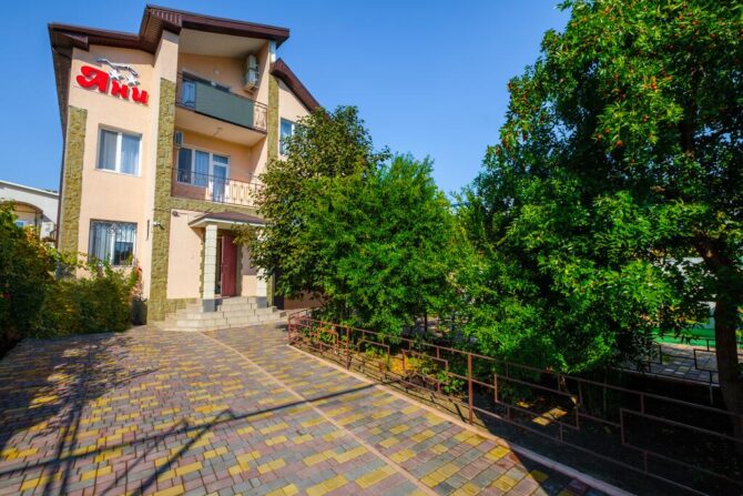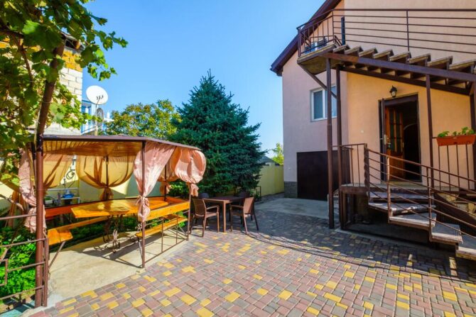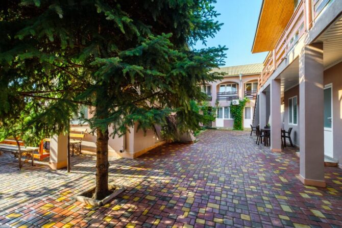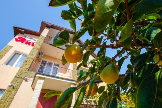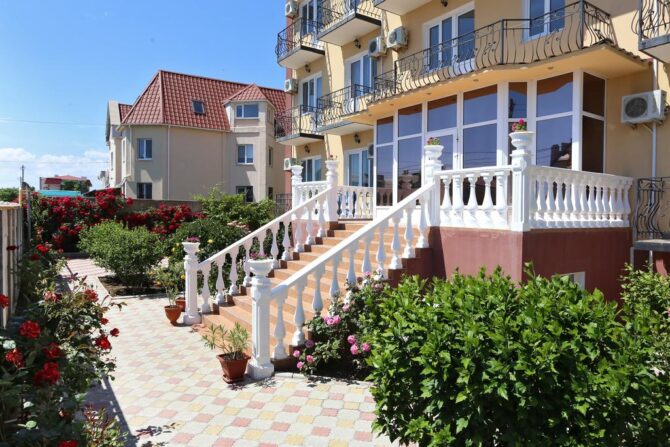 Мини-отель построен на первой береговой линии. Это 3-этажное здание, в котором все номера имеют балконы. Для семейного отдыха с детьми здесь созданы лучшие условия. Номерной фонд просторные, есть место для установки дополнительного спального места все удобства. Семейным парам лучше всего заказывать двухкомнатные номера. В каждом из них предусмотрена система кондиционирования и холодильник. Во дворе находится детская площадка с качелями, батутом и песочницей. Рядом установлен каркасный бассейн, в котором можно купаться, не выходя с территории гостиницы. В здании открыто кафе. Питание не входит в стоимость проживания. Завтрак, обед и ужин заказываются по меню.