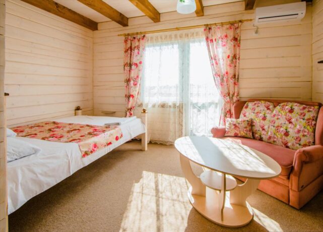 - 2-комнатный стандарт на первом этаже без балкона. Установлены двуспальная кровать, раздвижной диван для 2-х человек и раскладное кресло-кровать.