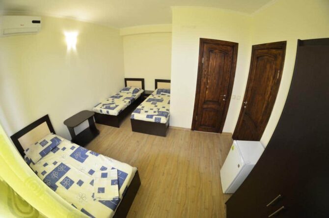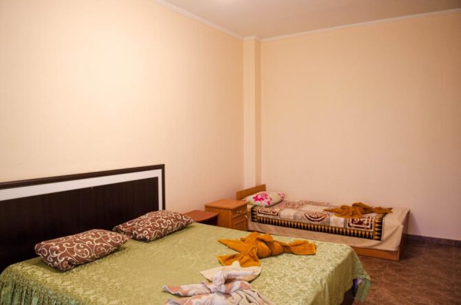 В 600 метрах от пляжа находится современный гостевой дом «Александра». Интерьер номеров специально разработан для удобного размещения членов семьи. Для родителей предусмотрена двуспальная кровать, для детей – удобные односпальные кровати (не раскладушки или диваны, а полноценные спальные места). В номерах установлены кондиционеры и холодильники. Оборудован совместный санузел. Имеется общая кухня для приготовления еды. На территории работает кафе. Завтрак включен в стоимость проживания. По меню подаются обед и ужин. Во дворе находится мангальная зона с беседкой.