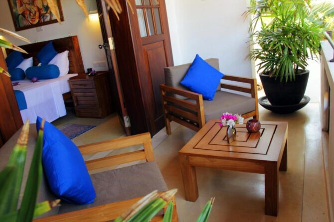 Жилой фонд отеля составляют главный дом с двухместными номерами и пляжное бунгало. Гостиничный комплекс находится в частном секторе рядом с домами местных жителей. От основного дома до пляжа идти около 5 минут. Владельцы учли интересы туристов, желающих проживать рядом с океаном и тех, кто не любит пляжную суету. Каждое утро гостям подается завтрак. Можно выбирать между континентальным (европейским) и азиатским вариантами блюд. Отдохнуть от палящего солнца можно на просторной террасе или в уютной гостиной. Во всех номерах предусмотрены кондиционеры, отдельные ванные комнаты, мини-холодильники, чайные/кофейные станции. Заботливый хозяин предоставляет трансфер от/до аэропорта (услуга платная), а также помогает в организации экскурсий по острову. Обед и ужин приготовят работники по дому по предварительному запросу. Но гости обычно предпочитают оставаться на пляже и пользоваться услугами многочисленных ресторанов, расположенных на берегу.