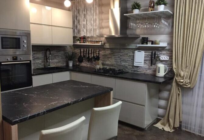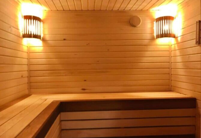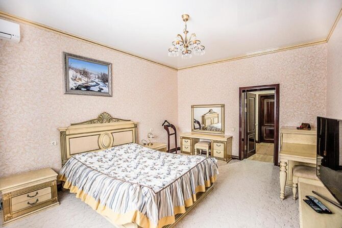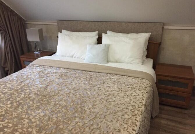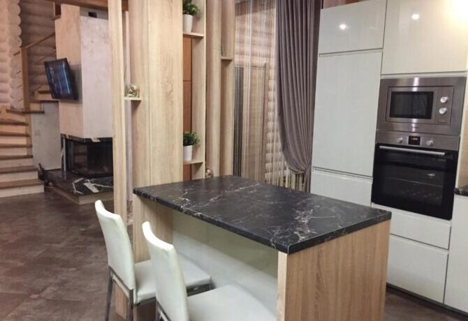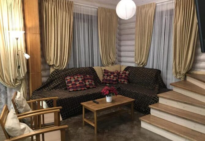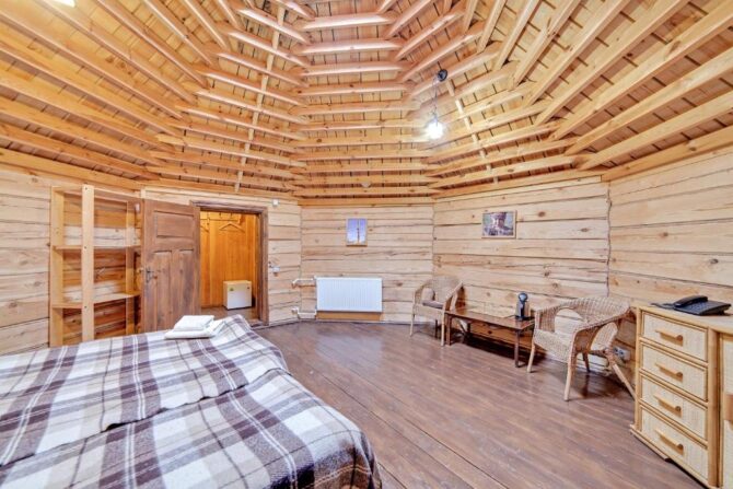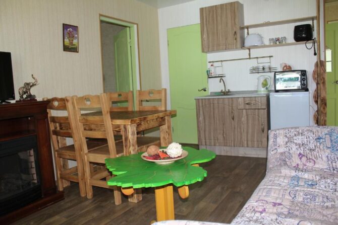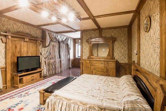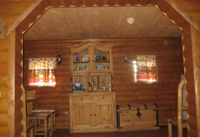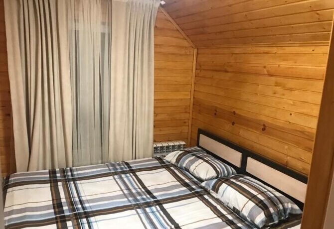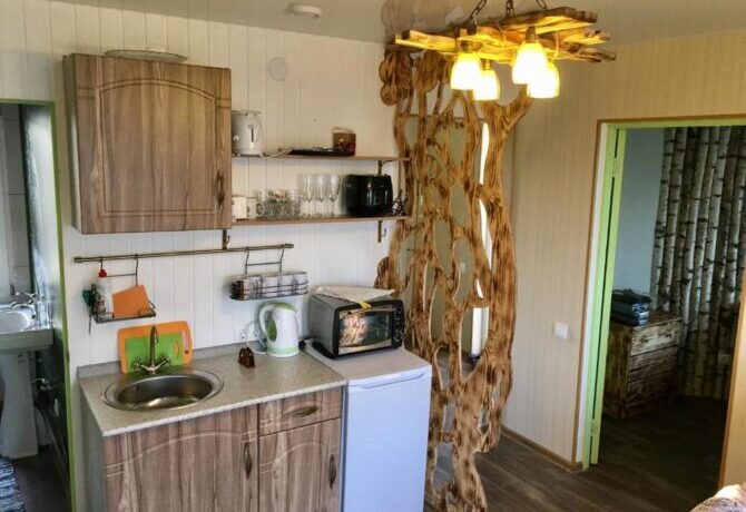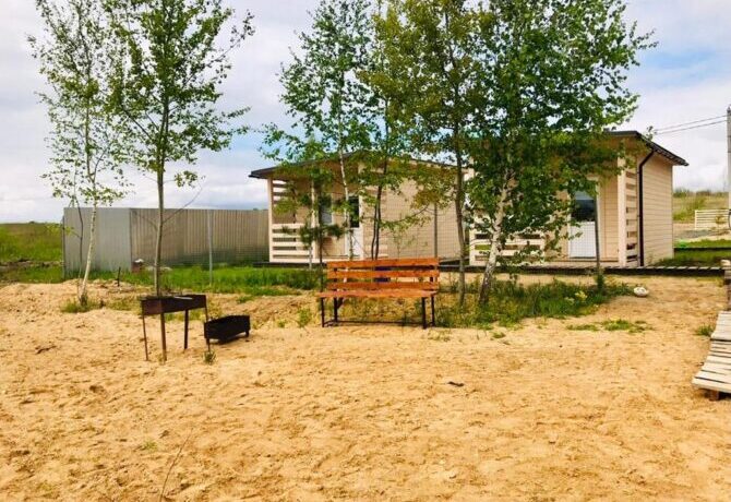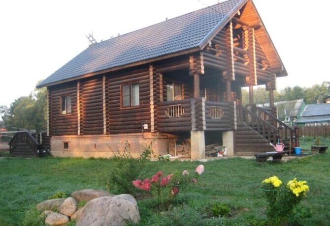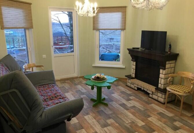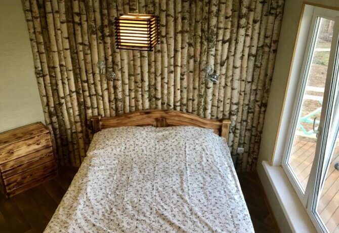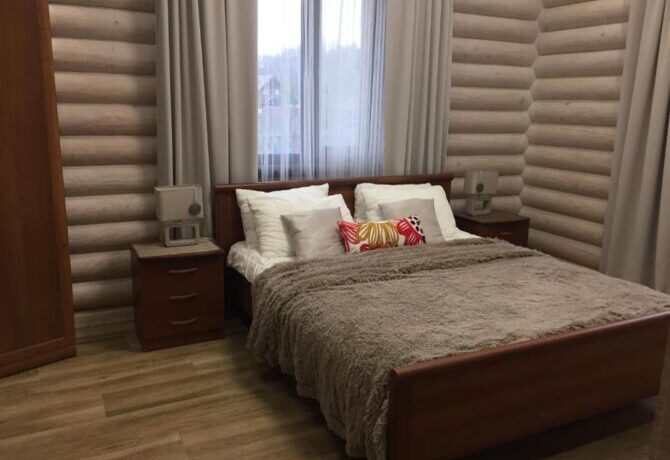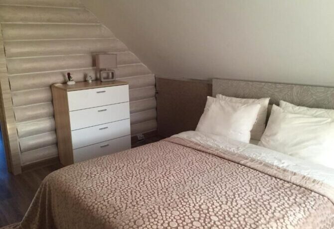 Это отдельный двухэтажный дом с четырьмя спальнями. На первом этаже находится гостиная с камином, хорошо оборудованная кухня с обеденной зоной, другими словами – общий лаундж. На втором этаже находятся спальни с ванными комнатами. Снаружи дом напоминает сказочный терем – бревенчатый, с резными наличниками и балконом. Внутри – настоящий модерн – современная бытовая техника, мебель, удобные кровати. Двор перед домом ухоженный, растут елочки, оборудована небольшая детская игровая площадка. Хозяева предоставляют гостям место и принадлежности для приготовления шашлыков.