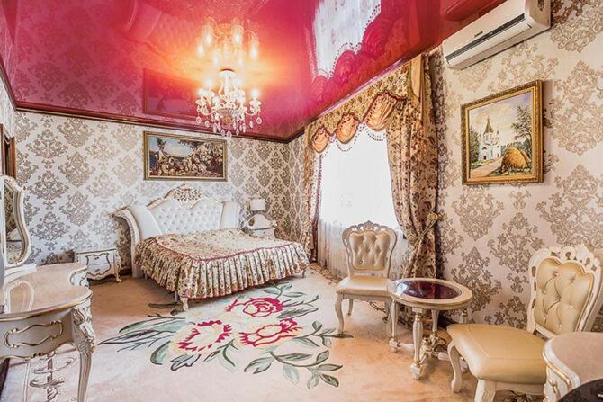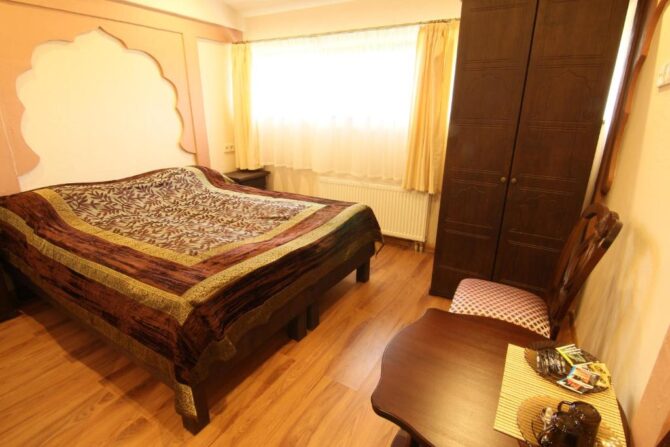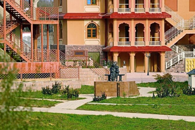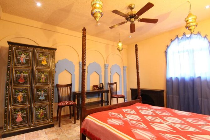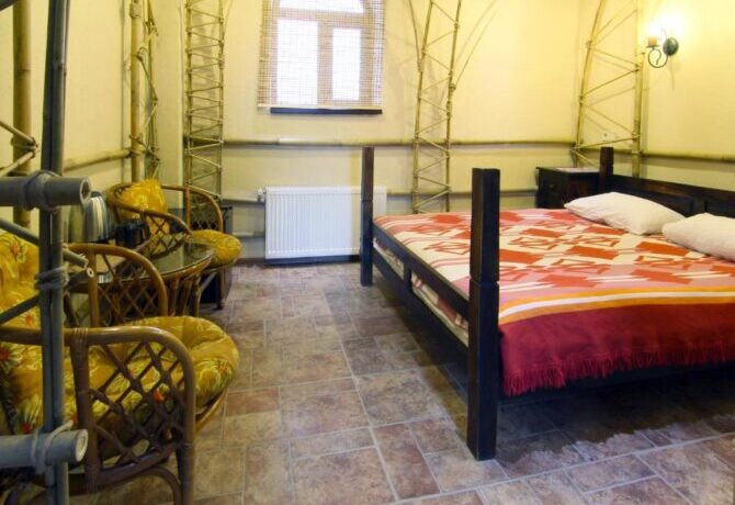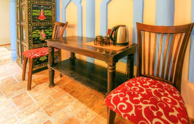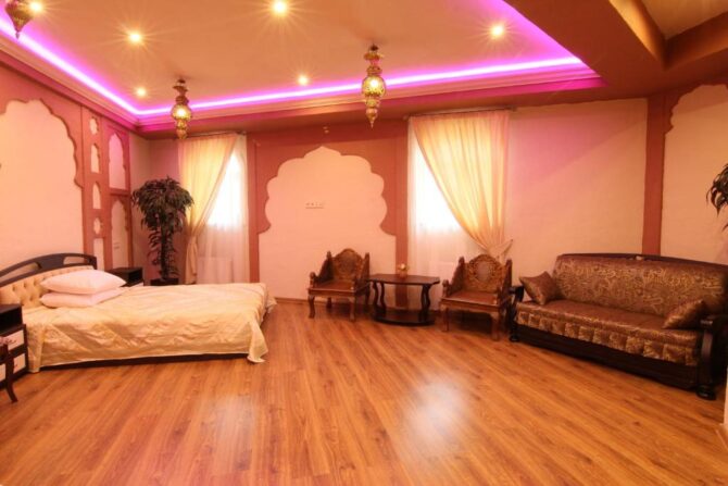 Гостиница, построенная в индийском стиле, полностью передает атмосферу и дух далекой страны. В уютных номерах можно почувствовать себя падишахом или раджой. Интерьер продуман до мельчайших деталей – низкая кровать, декоративные элементы, яркая цветовая гамма. Утром в ресторане накрывается континентальный завтрак. В каждом номере имеется чайник. Гостям предоставляется сервис по доставке еды и напитков. К услугам постояльцев – народные индийские костюмы для фотосессий, мастер-классы по освоению национальных ремесел, развлекательные программы.