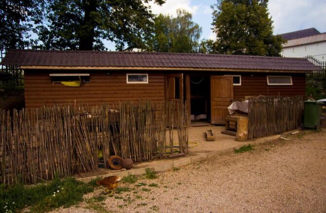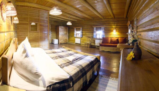 Появилось желание пожить в настоящем деревенском доме? Добро пожаловать в «Русское подворье». Бревенчатая изба с чердачным помещением ждет гостей во всей своей аутентичной красе. Внутри современные удобства стилизованы под старину. Обедать предстоит за деревянным столом, сидя на сундуке. Зато готовить еду можно на современно оборудованной кухне (никаких печей, дров и растопок). Все цивилизованно. Но это не просто гостиница – это натуральная эко-ферма, на которой разводят домашнюю птицу и лошадей. Поэтому на завтрак гостей ждут блюда из свежих яичек, а после – прогулка верхом или на санях.