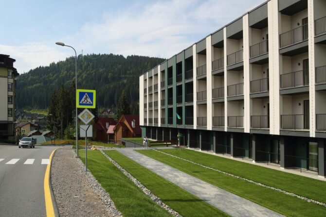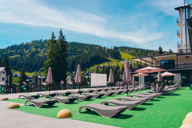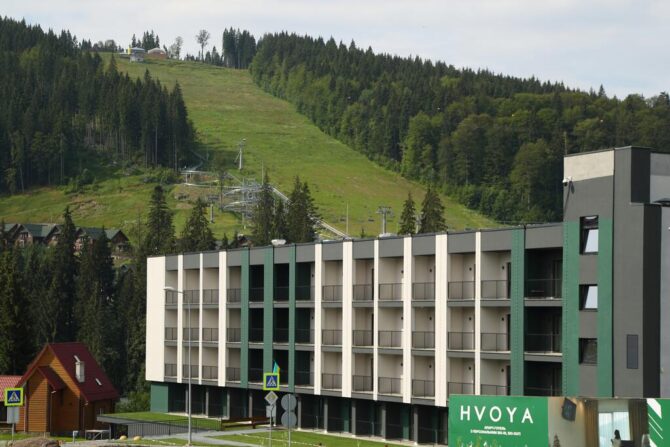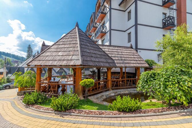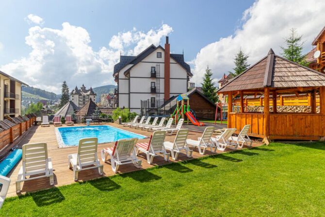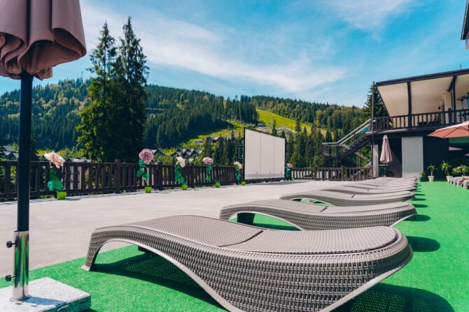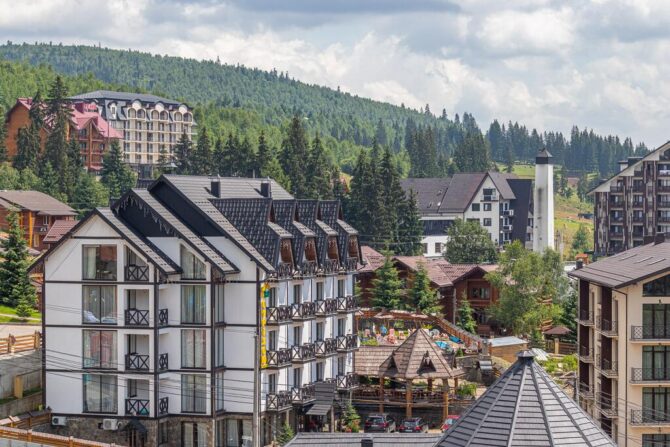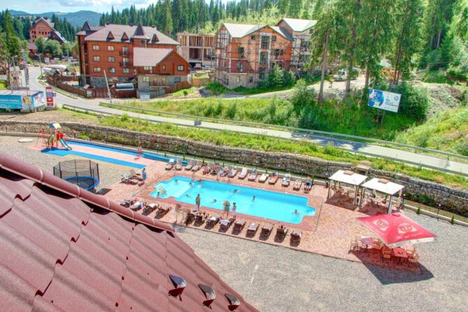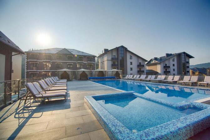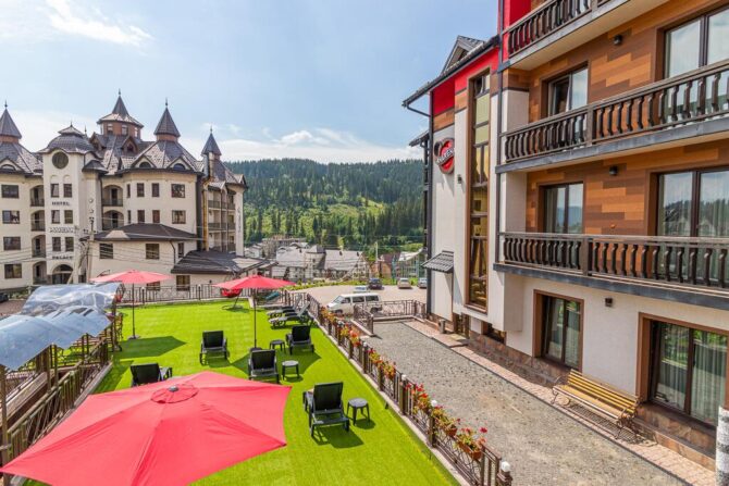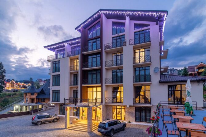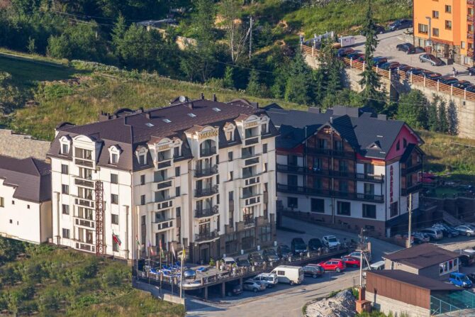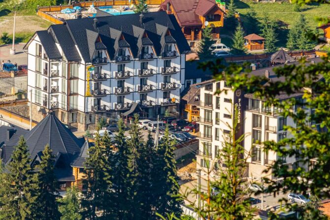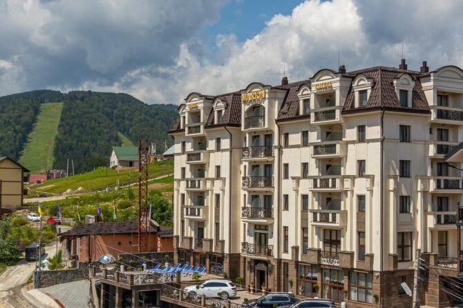 Один из лучших гостиничных комплексов Буковеля Radisson Blu Resort Bukovel отмечен 5 звездами. Это отель высшей категории с высоким уровнем сервиса и широким ассортиментом услуг. Для размещения предусмотрен большое количество разнообразных номеров – всего 252 номера. Среди них есть семейные, полулюксы, люксы и спа-люксы с террасой. Дети до 12 лет проживают бесплатно. На ресепшене установлен банкомат, работает пункт обмена валют. Лыжные склоны, трассы и спортивные площадки находятся в шаговой доступности. Комплекс расположен рядом с четырехкресельным подъемником № 7. Завтрак – шведский стол. В течение дня к услугам гостей представлены 2 ресторана, 2 бассейна, спа-салон, финтес-центр, сауна, турецкая баня, салон красоты, солярий. Кроме лыжных видов спорта здесь можно заняться рыбной ловлей. Озеро Молодости находится в 2,5 км. До автовокзала Буковеля полтора километра.