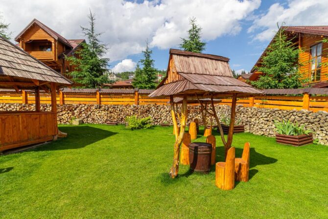 Отели, расположенные в районе Буковеля Урочище Вишня, отличаются комфортабельностью и удобным расположением к горнолыжным склонам. До подъемника 1R – 400 м. К услугам гостей оздоровительный спа-центр, крытый бассейн, сауна, хамам, бар. Континентальный завтрак накрывается в ресторане «Monisto», в течение дня он работает по меню европейской кухни. В 300 метрах находится ресторан украинской кухни «Грибова Хата». также недалеко работает супермаркет. Гостей размещают в номерах корпуса или коттеджах. В домиках оборудованы общие кухни.