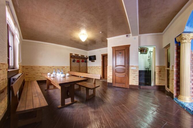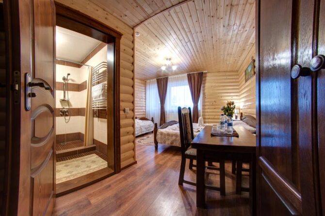 В оплату проживания входит завтрак и услуги спа-зоны. Здесь оборудованы 4 разнотипные бани: финская сауна, аналог римских терм, славянская парная и хамам). На территории есть открытый бассейн с подогревом. Бассейны есть возле каждого коттеджа, в общем корпусе (крытый), в каждой бане. Для гостей работает ресторан «Фомич», в котором предусмотрено детское меню. До автовокзала – 1 км.