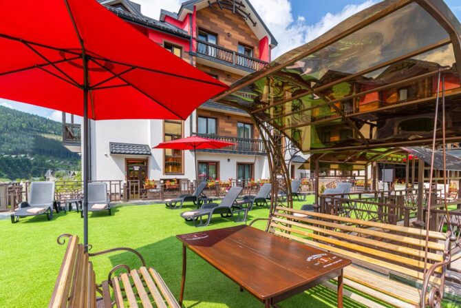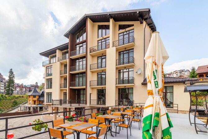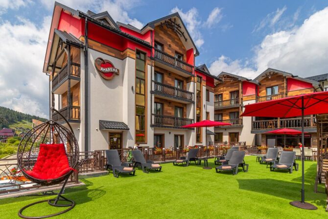 Возле склона № 1 в Буковеле расположен отель MARION SPA. До четырехкресельного подъемника 1R – 300 м. Номерной фонд представлен от стандартных до люксовых номеров. Есть свой ресторан, спа-центр, бассейн. По утрам подается континентальный завтрак или накрывается шведская линия. После завтрака ресторан открыт на обед, ужин, время коктейлей. Работает прокат лыжного снаряжения и велосипедов. Летом на живописных склонах прокладываются маршруты для прогулок. Зимой рядом с комплексом проходят трассы для беговых лыж.