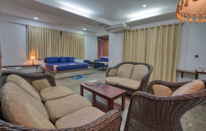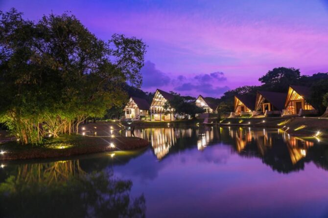Для зарубежных туристов, мечтающих отдохнуть несколько дней в окружении первозданных джунглей, наиболее подходящим вариантом станет «Сандарас» – четырехзвездочный спа-отель, расположенный в 1,1 км к юго-востоку от пещерного храмового комплекса. Пятиэтажное здание гостиницы вмещает 25 номеров четырех категорий. На территории Sundaras находится все, что обеспечивает разнообразный досуг отдыхающих: