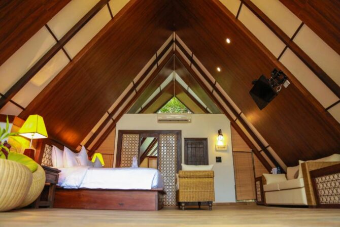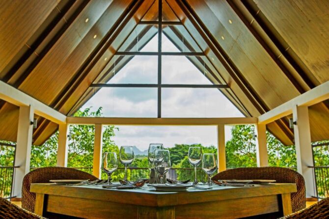 В отдельном доме расположен уютный ресторан, похожий на большой шатер с деревянной крышей, которую поддерживают колонны. В гастрономическом заведении подают ланкийские и индийские блюда.