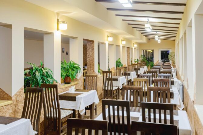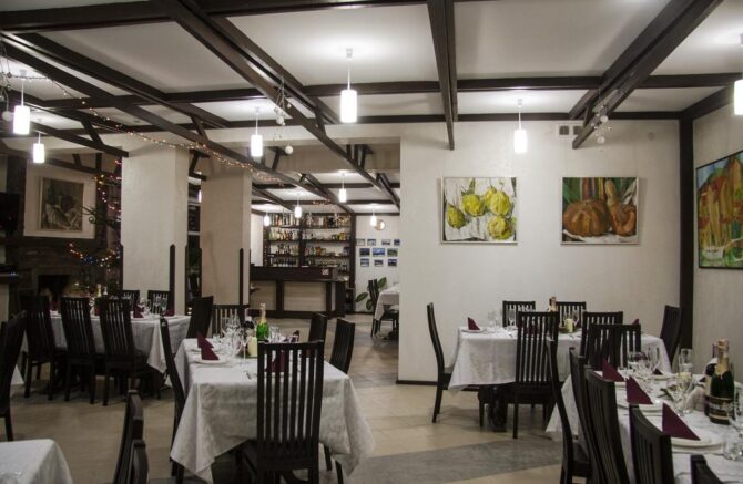 Рестораны поселка специализируются на блюдах украинской, европейской, закарпатской кухни. На территории открыто большое количество шашлычных, закусочных, кафе. Проблем с питанием не возникнет.