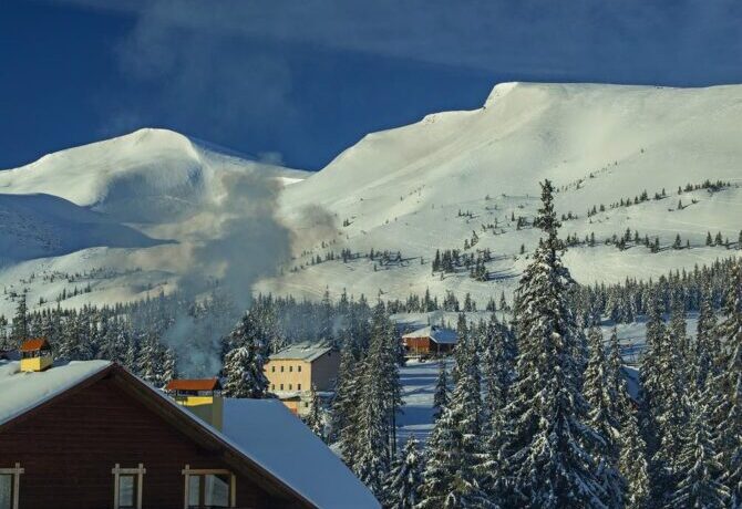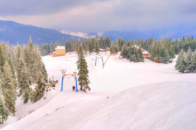 Недалеко от Буковеля находится самый высокогорный курорт Украины – Драгобрат. Он окружен тремя вершинами – Стог, Жандарм и Близница. Хребет имеет форму подковы. Снег на них удерживается с ноября по май. Перепад высот – 500 м. Проложены одна синяя, 3 черные и 5 красных трасс. Горнолыжные склоны обслуживают 10 подъемников: 2 бугельных и 8 кресельных. Отели представлены в виде 2-х больших комплексов и нескольких гостевых домов.