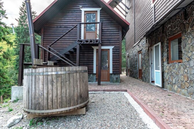 Большой отель с собственным рестораном находится в нескольких метрах от бугельного подъемника ГК «Драгобрат». Для заселения гостей есть номера разной ценовой категории, в том числе семейные. Утром накрывается завтрак. Парковка бесплатная. К услугам постояльцев: сауна, чан, зоны отдыха на этажах.
