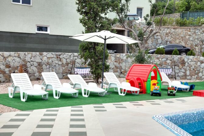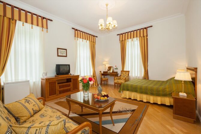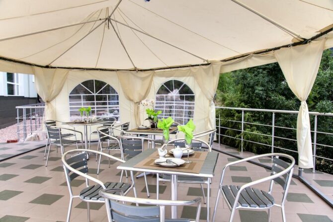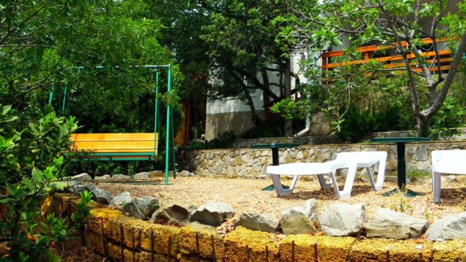 Среди 20-ти номеров Green Hill есть несколько апартаментов с кухней – это идеальный выбор для семьи, особенно если ребенок не один. Маме, конечно, отдохнуть не получится, но все остальные будут довольны. Для детей оборудована площадка на улице и игровая комната в корпусе. Но, как водится в подобного уровня заведениях, туда редко кто отправляет детей.