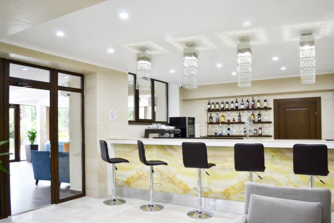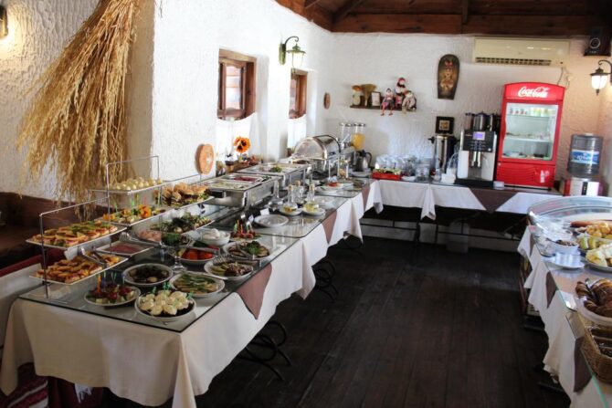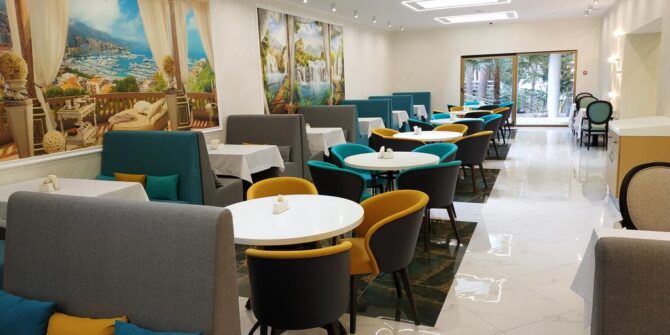 Отельный ресторан работает по системе все включено, что особенно важно для тех, кто отдыхает с детками. В весенний и летний период для гостей сервируют богатейший шведский стол. Летом и зимой предусмотрено порционное питание. Между вторым и третьим этажом расположилась кофейня – лучшее место для отдыха в душевной компании. Здесь представлен широкий выбор чая и кофе, отличным дополнением к которым станет выпечка или настоящие восточный сладости.