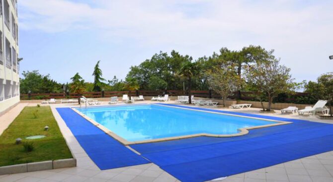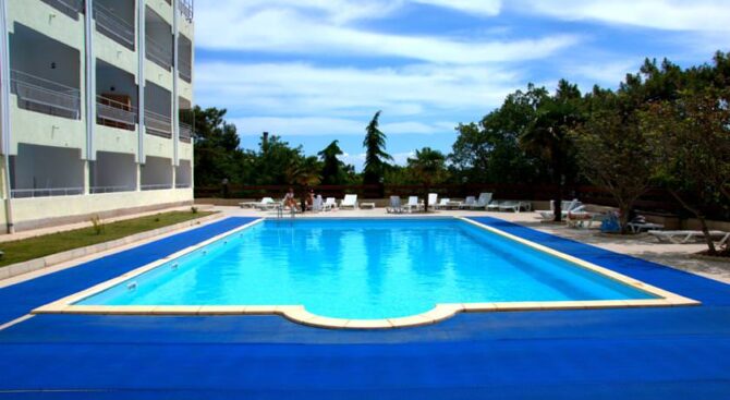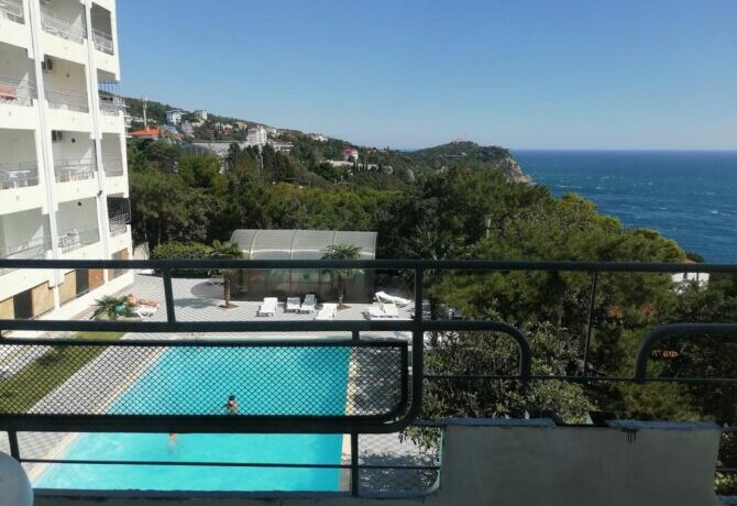 На территории отеля есть все для идеального отдыха – парк с детскими площадками и зонами отдыха, собственный пляж, попасть на который можно на лифте, либо пешком через парковую зону, сауна, ресторан, крытый бассейн с морской водой. Кроме того работает группа аниматоров, они с удовольствием организуют детский и взрослый досуг на свежем воздухе.