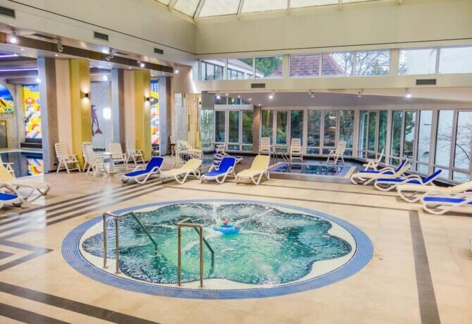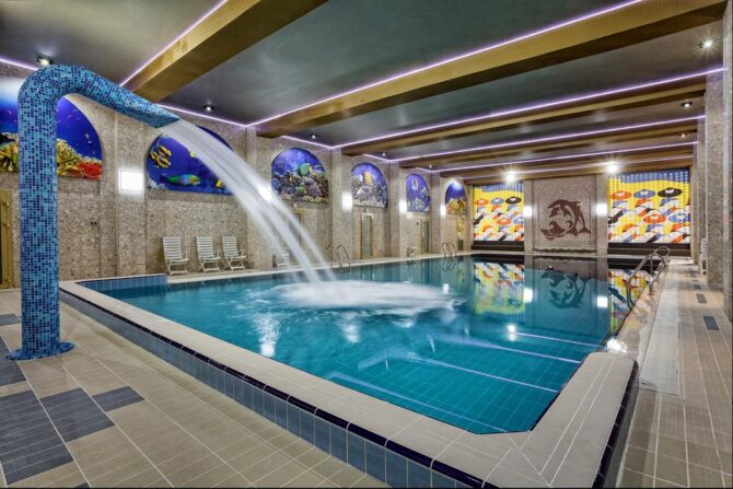 Во внутреннем дворике расположился бассейн с противотоком, водопадом, гидромассажем и гейзером. Он придется по душе как взрослым, так и деткам любого возраста. Во время водных процедур гости смогут порадовать себя вкуснейшим напитком, заказав себе любимый коктейль, а своим малышам свежайший сок, ведь барная стойка находится прямо в водной чаше. Вокруг бассейна оборудована комфортная зона отдыха. В межсезонье вода подогревается, что позволяет купаться даже при плохих погодных условиях.