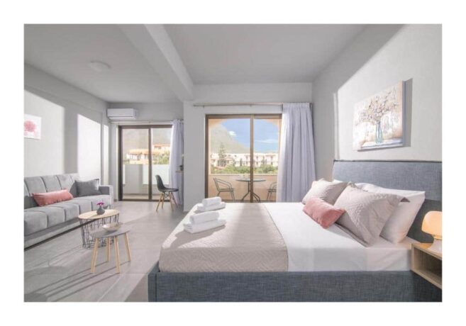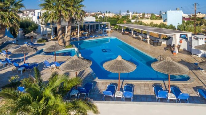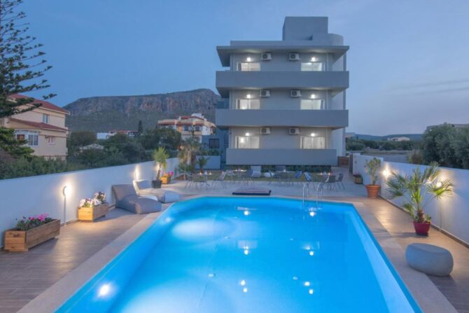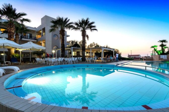Современный отель 4 звезды считается идеальным местом для проведения отпуска и уик-эндов. Условия максимально приближены к домашним. Гости отеля могут расслабиться в баре у бассейна, освежиться экзотическими коктейлями или перекусить легкими восхитительными блюдами, насладиться расслабляющими водами большого бассейна, поразмышлять в комфорте лобби, попивая кофе. 67 номеров разделены на два уровня комфортности – стандарты и улучшенные семейные. На завтрак подаются свежие фрукты, мюсли, греческий мед и йогурты, яйца, сыры, сосиски и традиционные критские блюда. На обед и ужин также накрывается шведский стол за отдельную плату. Бар расположен на первом этаже. До ближайшего пляжа идти около километра.