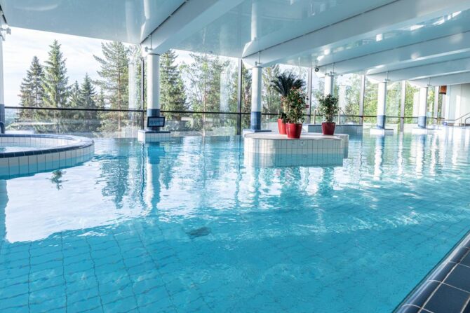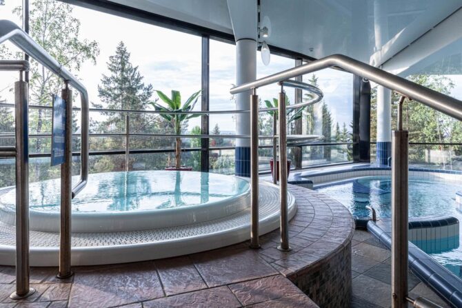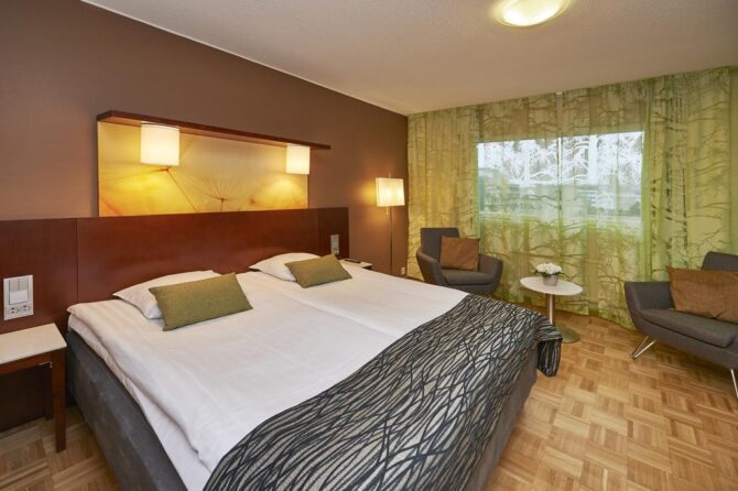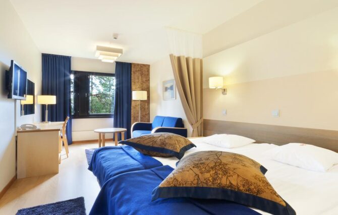 Большой спа-комплекс расположен в природной зоне в 5-ти минутах езды от центра Ювяскюля на берегу озера Туомиоярви. Номерной фонд составляет 196 комнат разной ценовой категории, из них 68 являются гипоаллергенными. Завтрак не входит в стоимость проживания, подается после дополнительной договоренности и оплаты. На территории работают ресторан, круглосуточный продуктовый мини маркет. Есть бесплатная парковка. К услугам гостей предоставляются сауна, боулинг, прокат велосипедов, спа-центр с гидромассажными ваннами. До ближайшего горнолыжного курорта Лааявуори – 1 км.