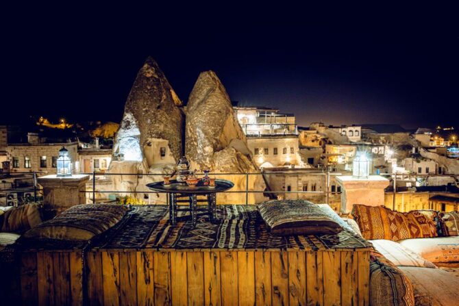 Sultan Cave Suites – известен в соц.сетях террасой на крыше, с нее открывается прекрасный вид на Герем, воздушные шары и восхода солнца. Очень романтично! На рассвете только гости отеля могут любоваться одними из лучших видов в Каппадокии.