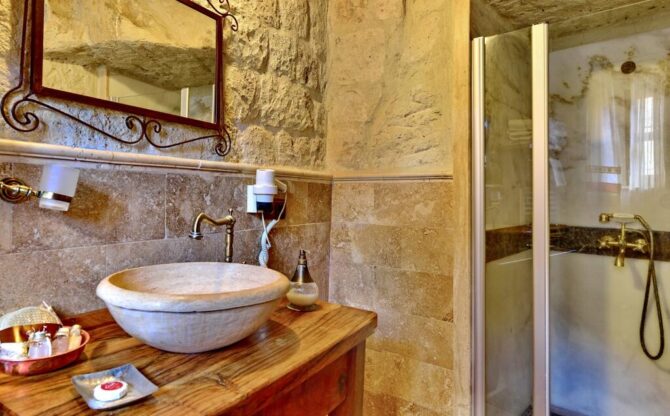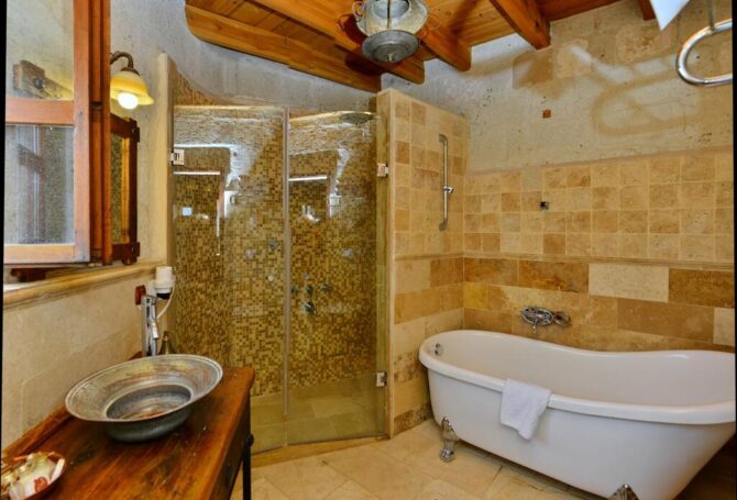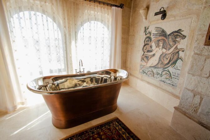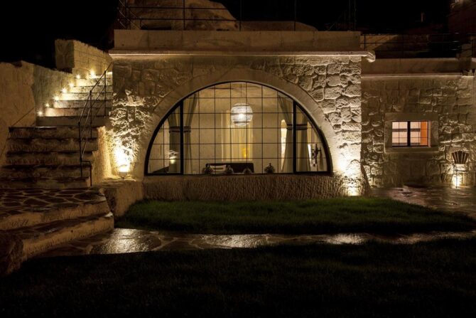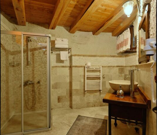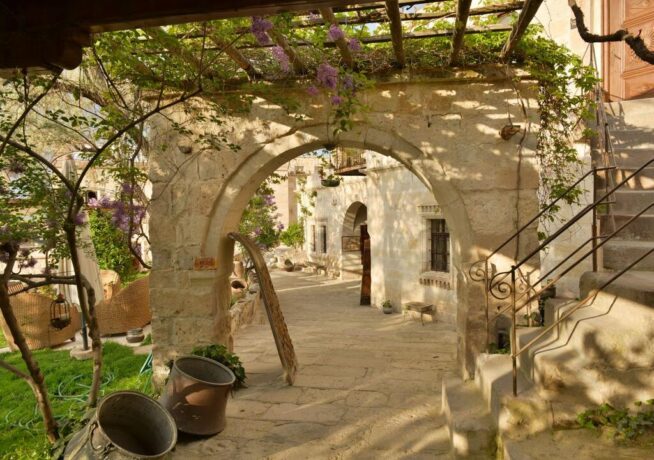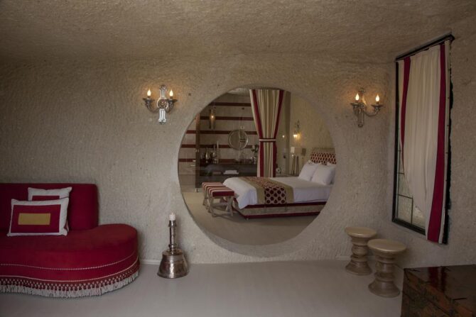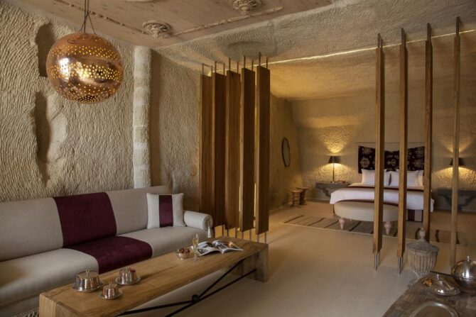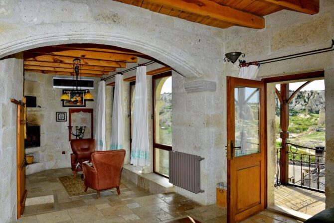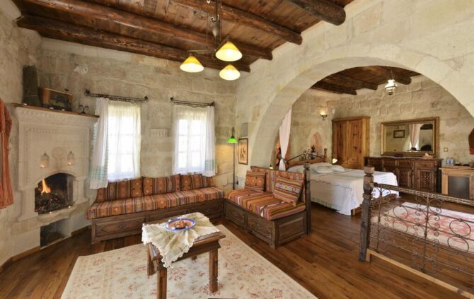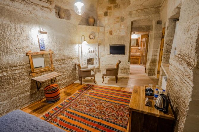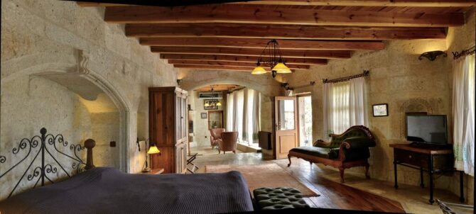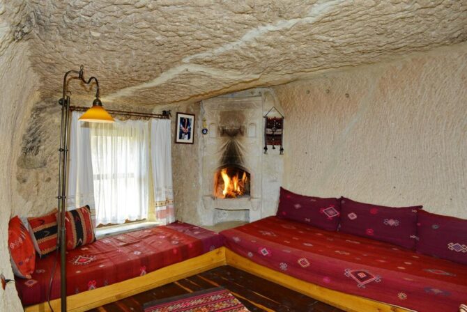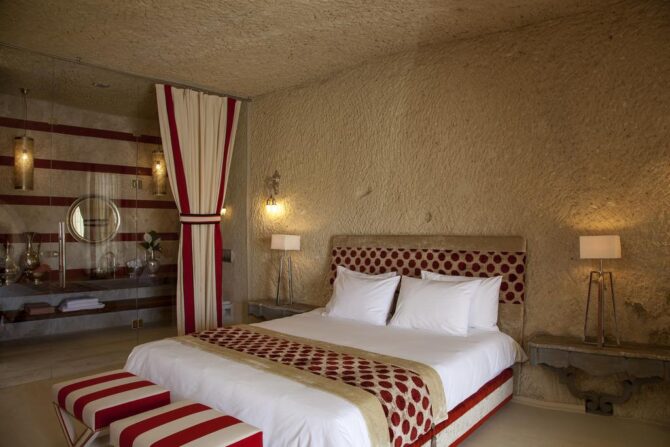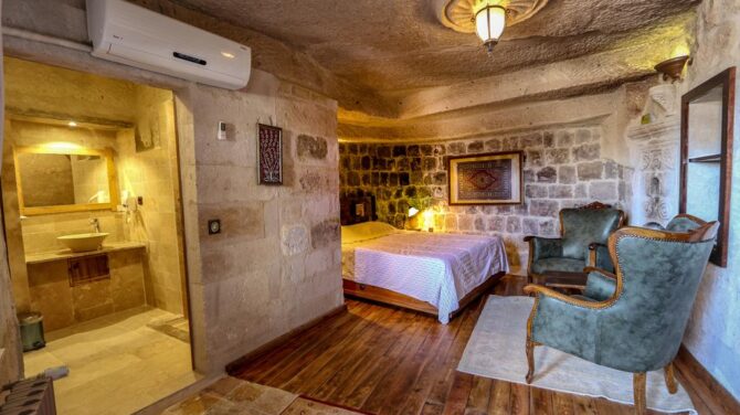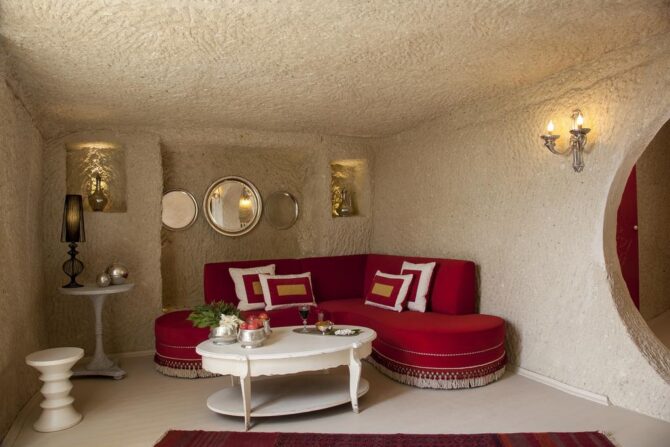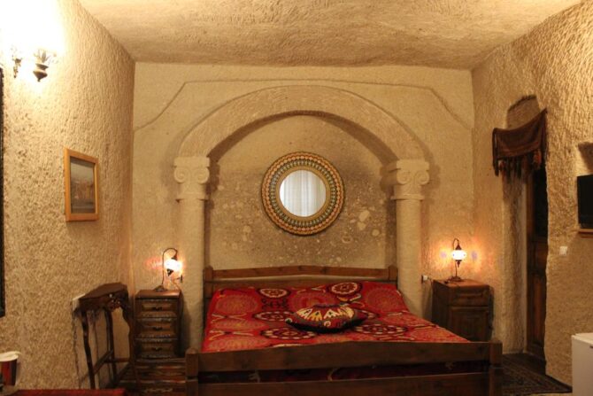 Если остановиться в одном из пещерных отелей, то можно почувствовать себя местным жителем тысячу лет назад Многие пещерные отели дают возможность насладиться роскошью и почувствовать себя царем. В отличие от домов местных жителей, эти бутик-отели оснащены такими удобствами, как хамам (турецкая баня), высокоскоростной интернет и современные ванные комнаты. Другие особенности включают в себя каменные арки, стены с рисунком вулканического цвета и панорамные террасы с видом на долину.