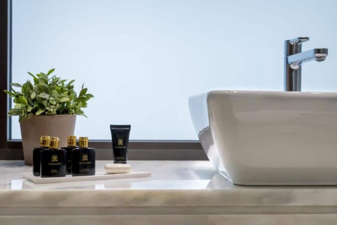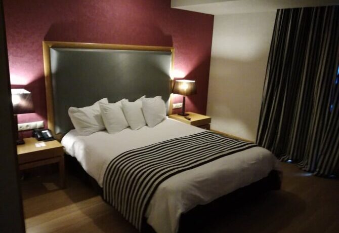Все 36 номеров отеля Europa оформлены в немного претенциозном эклектичном стиле, в котором смешались бурные 80-е, эстетика ТРЦ, борделей и представления касторианских дизайнеров о классике в дизайне интерьеров. Именно поэтому в отель Europa не стоит везти детей – множество ступенек, приступочек, острых скошенных углов, стеклянная мебель, скользкий полированный пол под мрамор в лаундже и слишком крутые лестницы на второй и третий этаж могут быть травматичными.