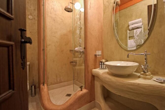 Получилось очень неплохо: отель весьма фотогенично выглядит с улицы, а комнаты изнутри отделаны натуральным деревом и камнем. В каждом номере богато украшенные потолки, иногда с балками и коваными люстрами, глубокие традиционные окна (с непривычки комнаты покажутся темными, но в жарком климате это даже плюс), стилизованные камины, витражи, элементы традиционных узоров и резьбы (никаких меандров, только северо-запад). На полу коврики ручной работы, в декоре использованы мотивы народных ремесел.